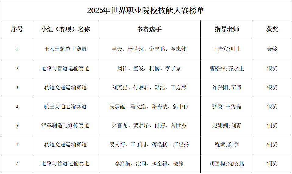 下一步,学校将以此次大赛为抓手,坚持“以赛促教、以赛促学、以赛促改、以赛促建”的育人理念,进一步推进产教融合,不断提升人才培养质量与社会服务能力,为交通强国建设和区域经济社会发展培养更多的高技能人才。(教务处 吴阳)