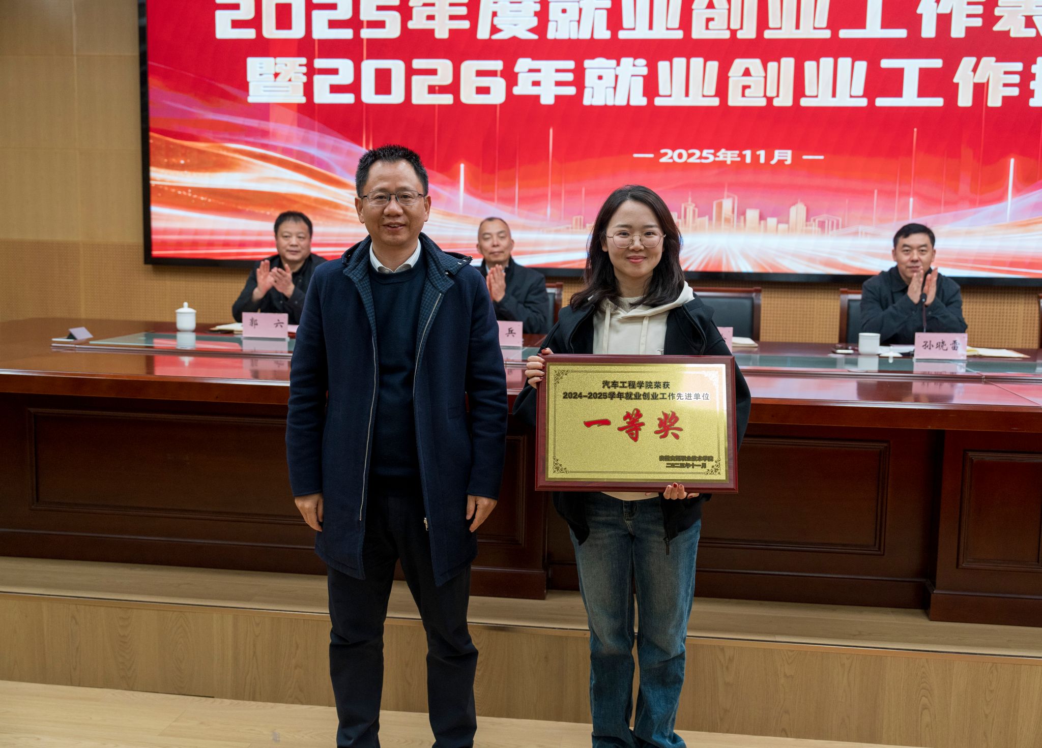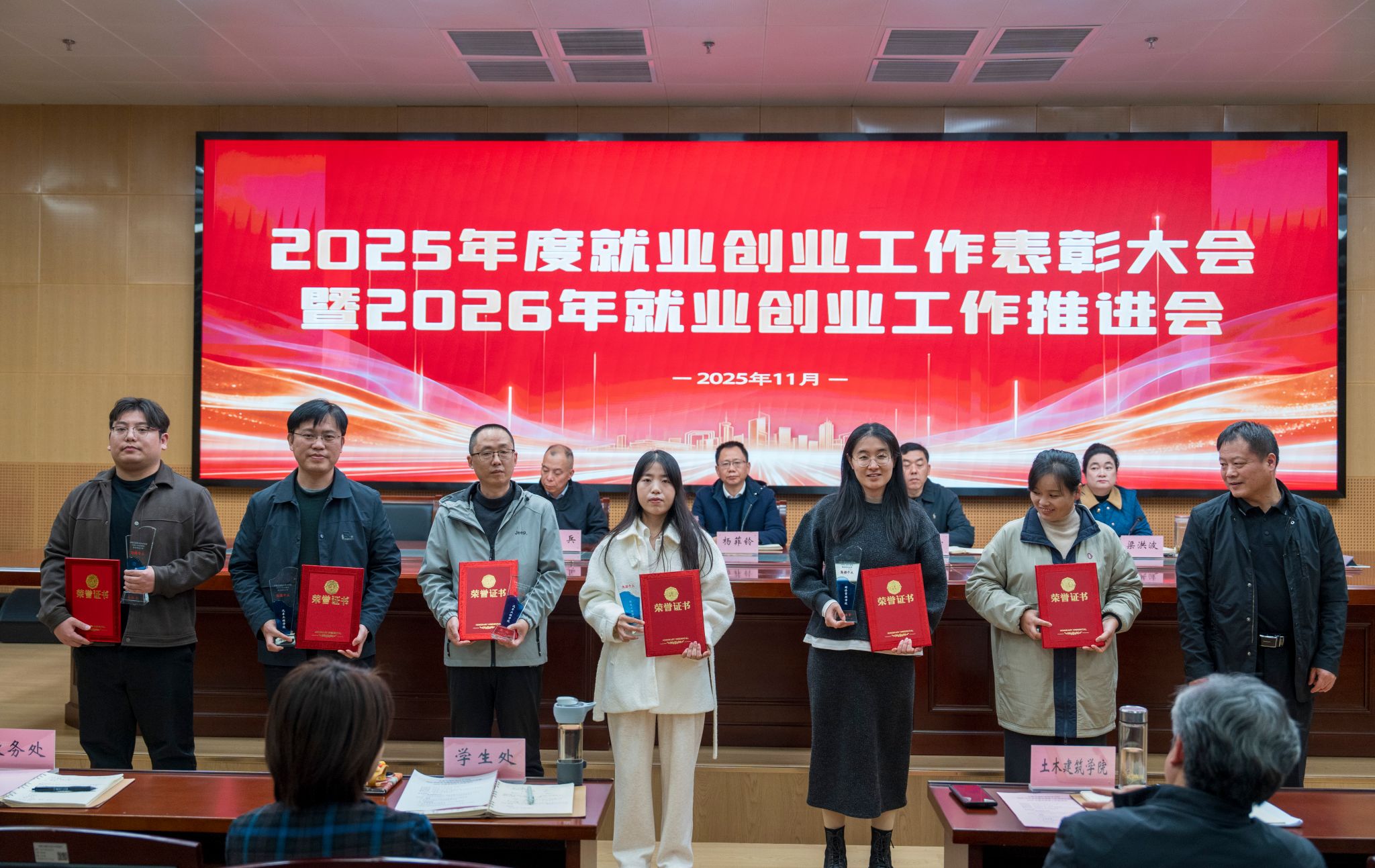 校领导为就业创业工作先进个人代表和就业工作先进集体颁发了荣誉证书