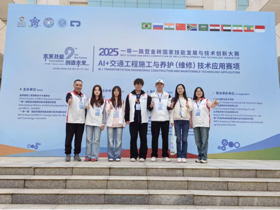 12月4日至7日,2025“一带一路”暨金砖国家技能发展与技术创新大赛之AI+交通工程施工与养护(维修)技术应用赛项全国总决赛在广西南宁成功举办。米兰土木建筑学院由叶生、叶枝老师指导的铁路队(24检测2班杨清琳、24检测4班毛乐奕阳)荣获团体一等奖;由杨锐、武余波老师指导的公路队(23路桥4班王超、24路桥1班汪妍)荣获团体三等奖。叶生、叶枝两位老师获评“优秀指导教师”,学校荣获“最佳组织奖”。