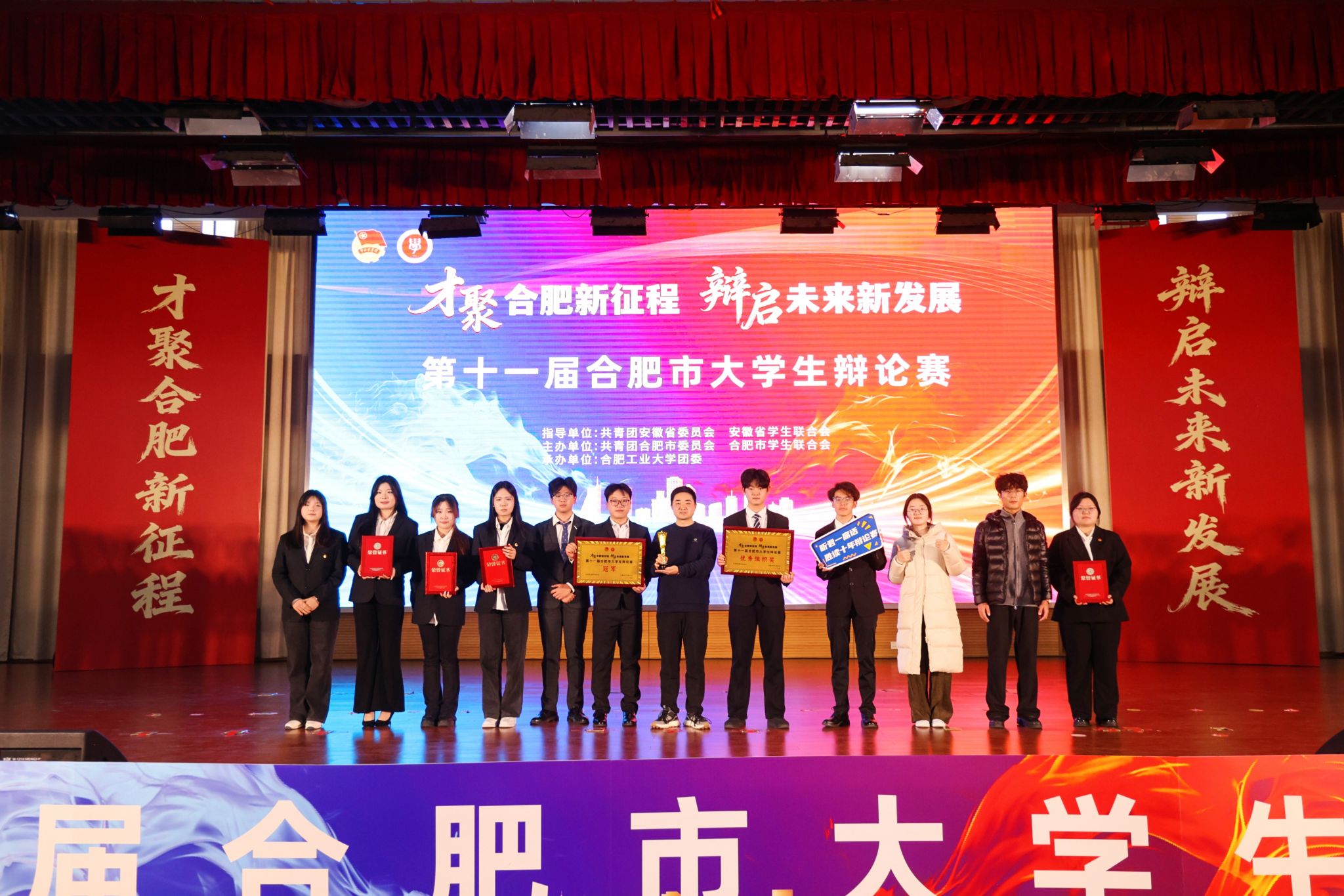 12月28日,第十一届合肥市大学生辩论赛在合肥工业大学落幕。本次赛事由共青团合肥市委、合肥市学联主办,共45所高校参与。经过43场角逐,米兰辩论队凭借出色表现夺得冠军,并获“优秀组织奖”;明萱雪儿、耿子怡、魏佳琪三位同学获“最佳辩手”称号。