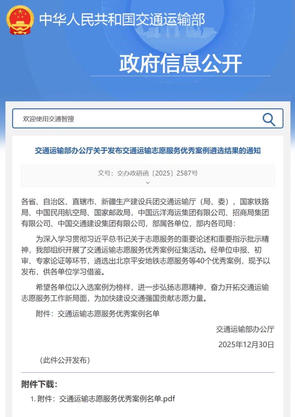 近日,中华人民共和国交通运输部办公厅发布交通运输志愿服务优秀案例遴选结果。