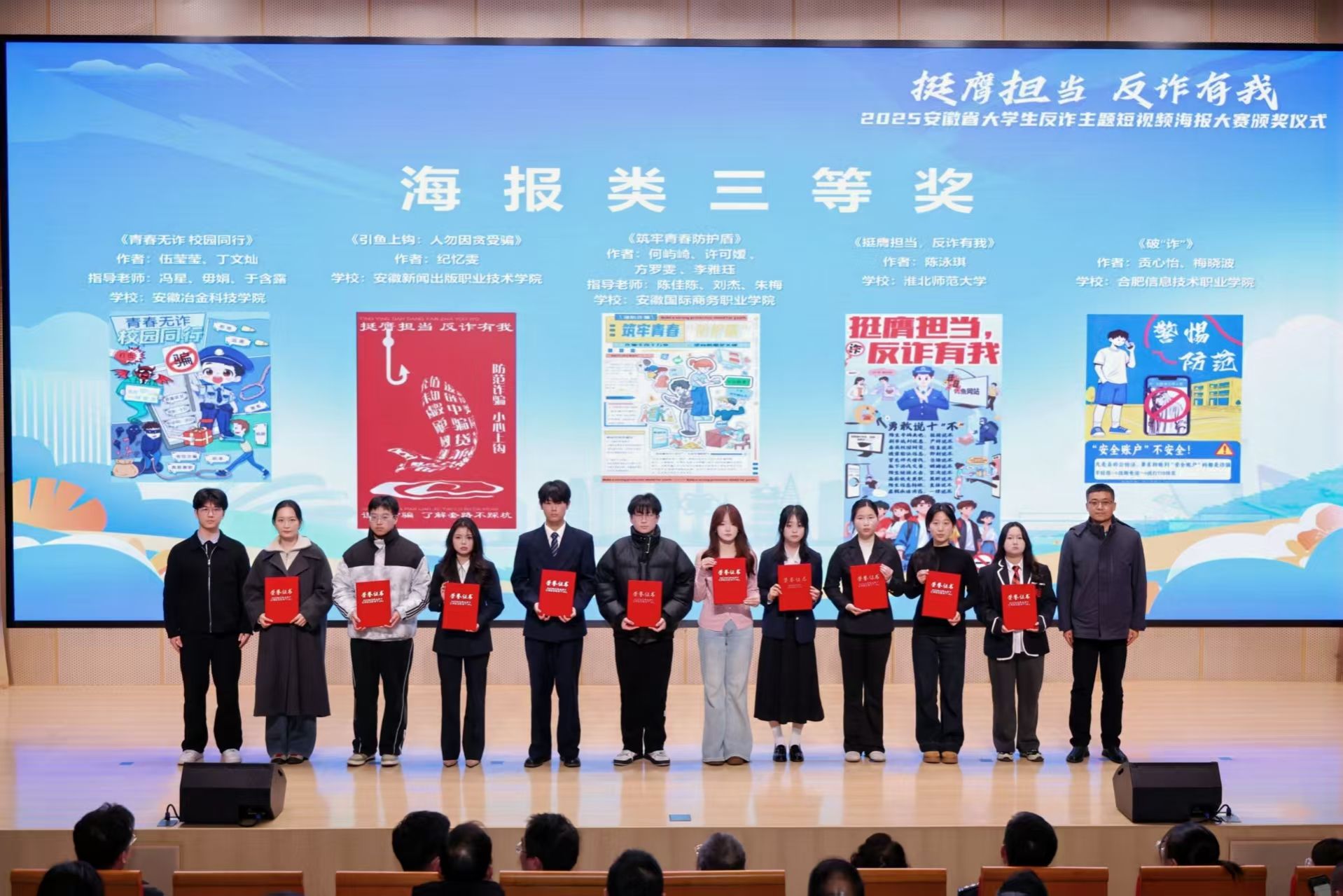 近日,米兰郝涵雨、李俊豪、白昕宇3名同学组成的创作团队,在由安徽省通信管理局、安徽省公安厅、安徽省教育厅、共青团安徽省委员会、安徽省学生联合会联合主办的2025年 “安徽省大学生反诈主题短视频海报大赛”中,凭借平面设计作品《这场 “游戏”,你永远赢不了》,以其新颖独特的创意构思、扎实精湛的专业技能、深刻鲜明的反诈内涵,在全省众多参赛作品中脱颖而出,获得海报类三等奖。