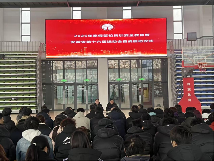 1月18日,学校举行2026年寒假留校集训运动员安全教育暨安徽省第十六届运动会高校部比赛备战启动仪式。副校长汤峰出席并讲话,会议对寒假集训安全管理与省运会备战工作作出再动员、再部署。