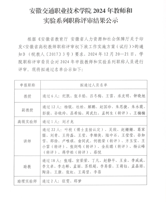 学院2024年教师和实验系列职称评审结果公示