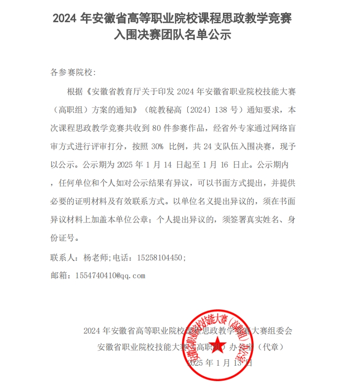2024年安徽省高等职业院校课程思政教学竞赛入围决赛团队名单公示