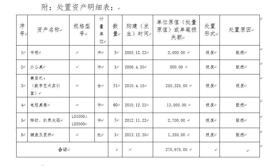 本次处置资产为已核准报废的书柜3件、办公桌1件、兼容机51台、电脑桌凳60件、移动、刻录光驱7件、键盘及鼠标1批,总计价值275675元的资产。(附:资产处置明细表)