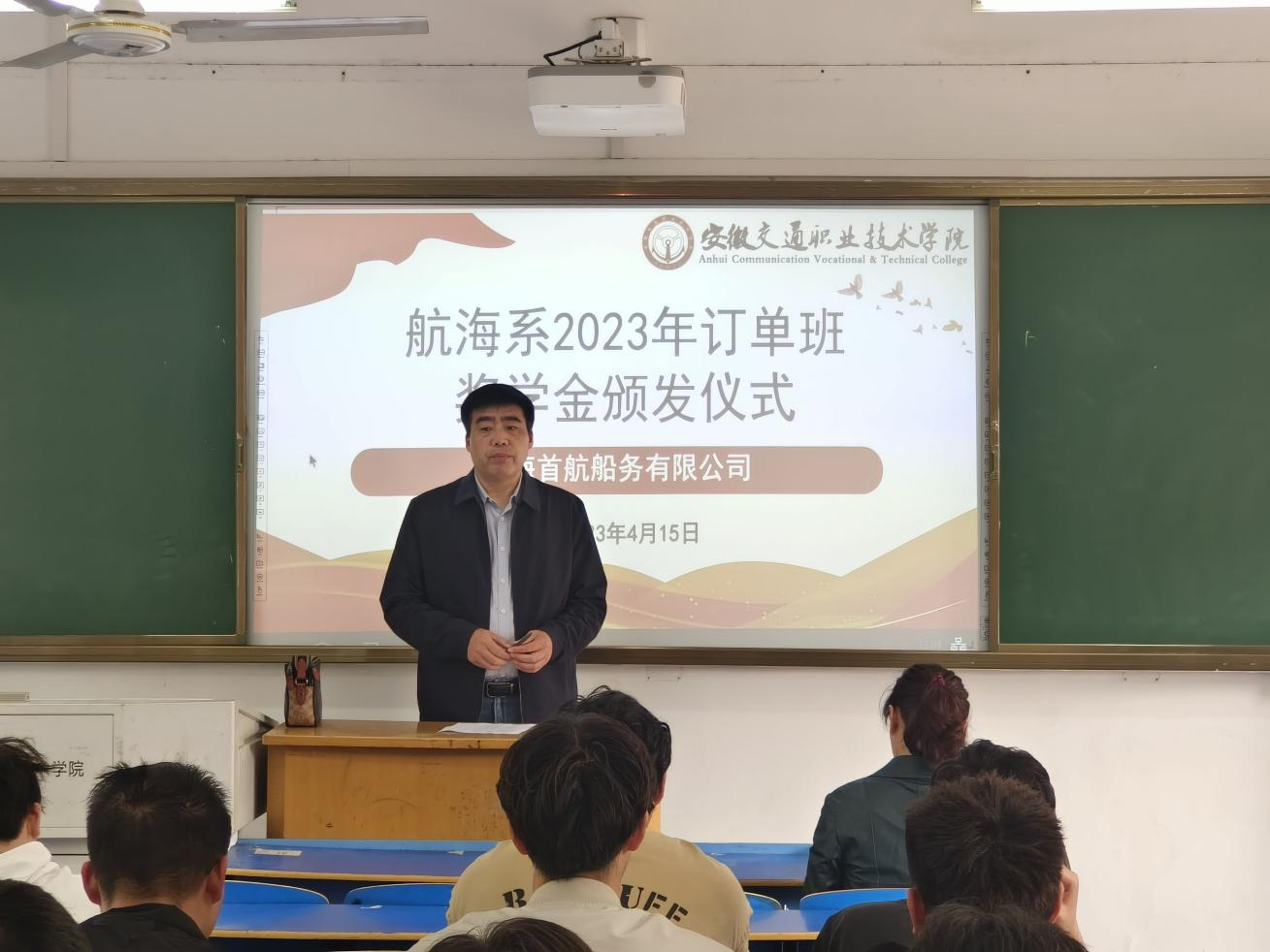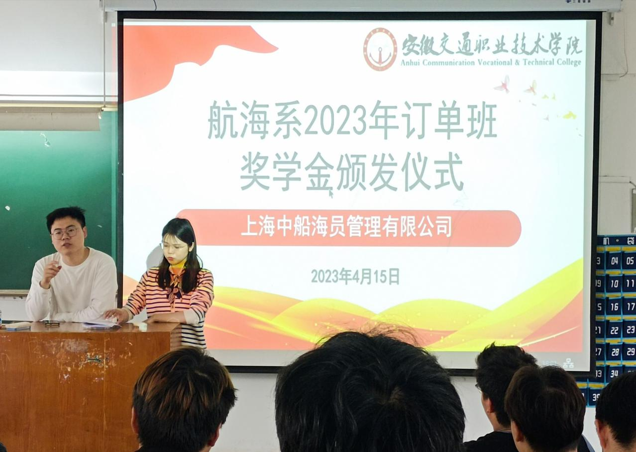 4月15日,航海系举行订单班企业奖学金颁发仪式,中远海运船员管理有限公司天津分公司刘长船长、大连国合海事技术服务有限公司毕崇峰船长、上海首航船务有限公司张保安轮机长、上海中船海员管理有限公司船员调度主管高江皓,航海系领导班子、学生管理老师、辅导员以及全体订单班学生参加了仪式。