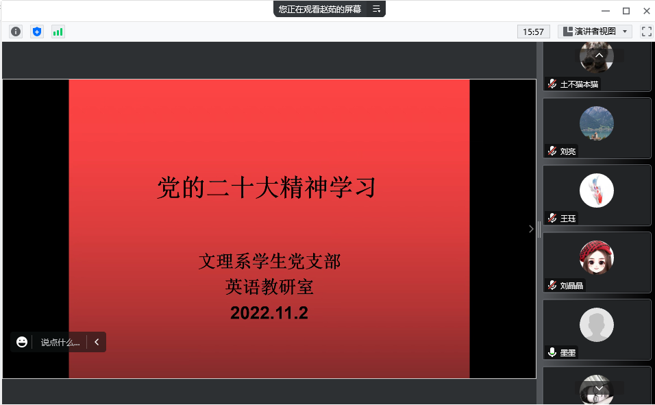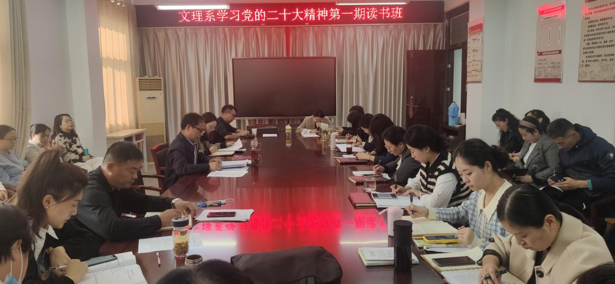 11月15日,文理系组织全体党员参加院党委理论学习中心组学习党的二十大精神第一期读书班分组讨论会。会上,系总支书记,下辖三个党支部书记分别结合自身工作实际分享党的二十大精神学习体会。