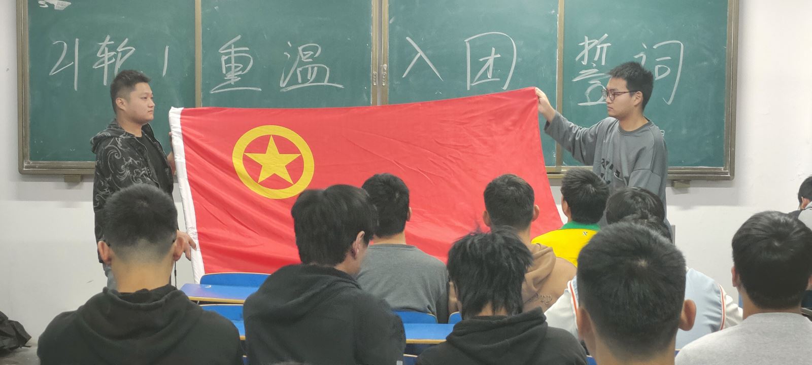 “我志愿加入中国共产主义青年团,坚决拥护中国共产党的领导,遵守团的章程……为共产主义事业而奋斗。”在火红的团旗前,团员青年们举起了右手再次宣誓,重温了当年入团时许下的神圣誓言。铮铮誓言,火热青春。简短、庄重、热烈的宣誓仪式,让同学们再次明确了自己的共青团员身份,同时明确了自己的义务和职责,自觉加强组织性、纪律性,增强了各团支部的向心力与战斗力。