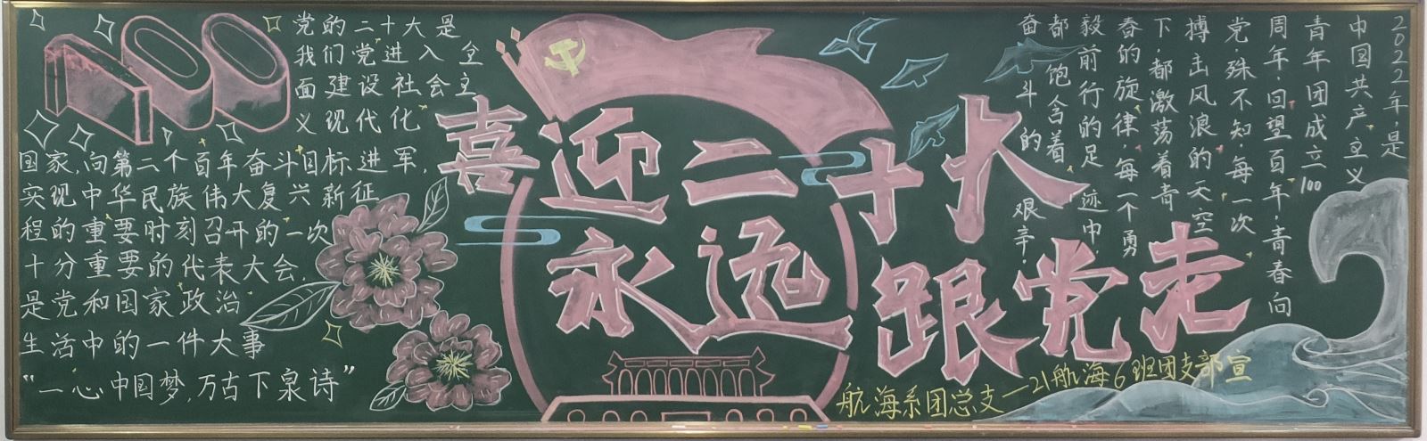 本次主题板报创作活动,是航海系团总支“喜迎二十大、永远跟党走、奋进新征程”主题教育活动之一。喜迎二十大,奋进向未来。航海系团员青年表示将立志成长为有理想、敢担当、能吃苦、肯奋斗的新时代好青年,树勤学之风,立报国之志,踔厉奋发,笃行不怠!(航海系 王晨)