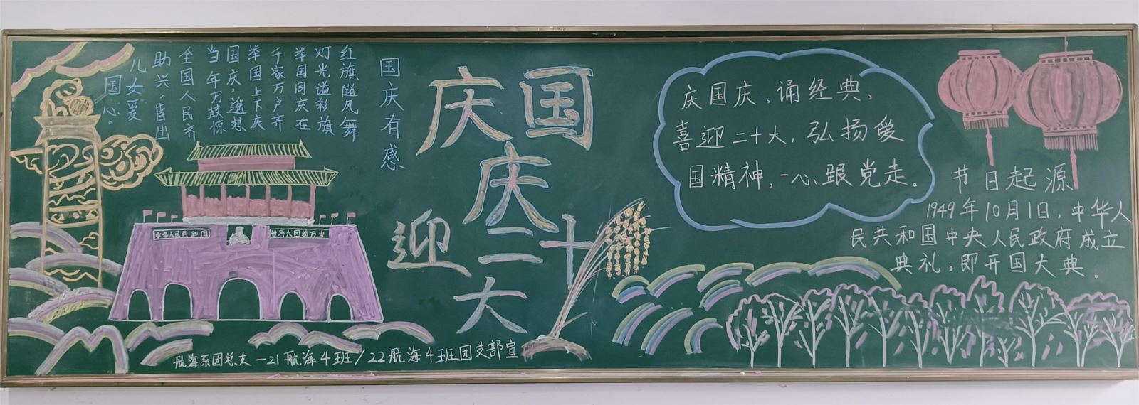 黑板报是航海系德育工作的宣传阵地,也是对学生进行美育熏陶、品德教育的载体。各班的黑板报主题鲜明,构思新颖,图文设计美观,穿插了大量的中国风元素。庄严的天安门城楼,鲜艳的五星红旗,营造出一片祥和的节日气氛,表达了对党和祖国的由衷热爱和赞美之情。