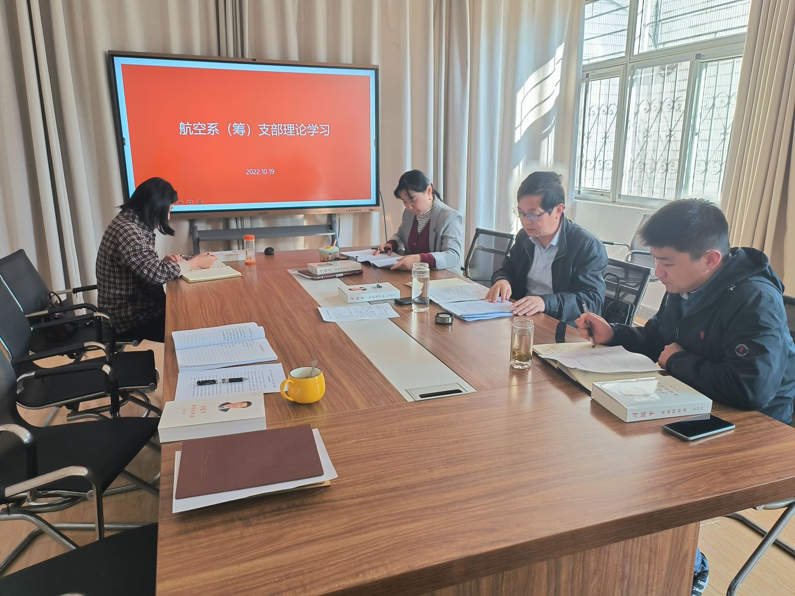 10月19日下午,航空系(筹)党支部在教学楼一楼会议室组织召开理论学习会,专题学习党的二十大精神。学院副院长、系党支部书记朱文胜主持会议并讲话,航空系(筹)党支部全体成员参加会议。