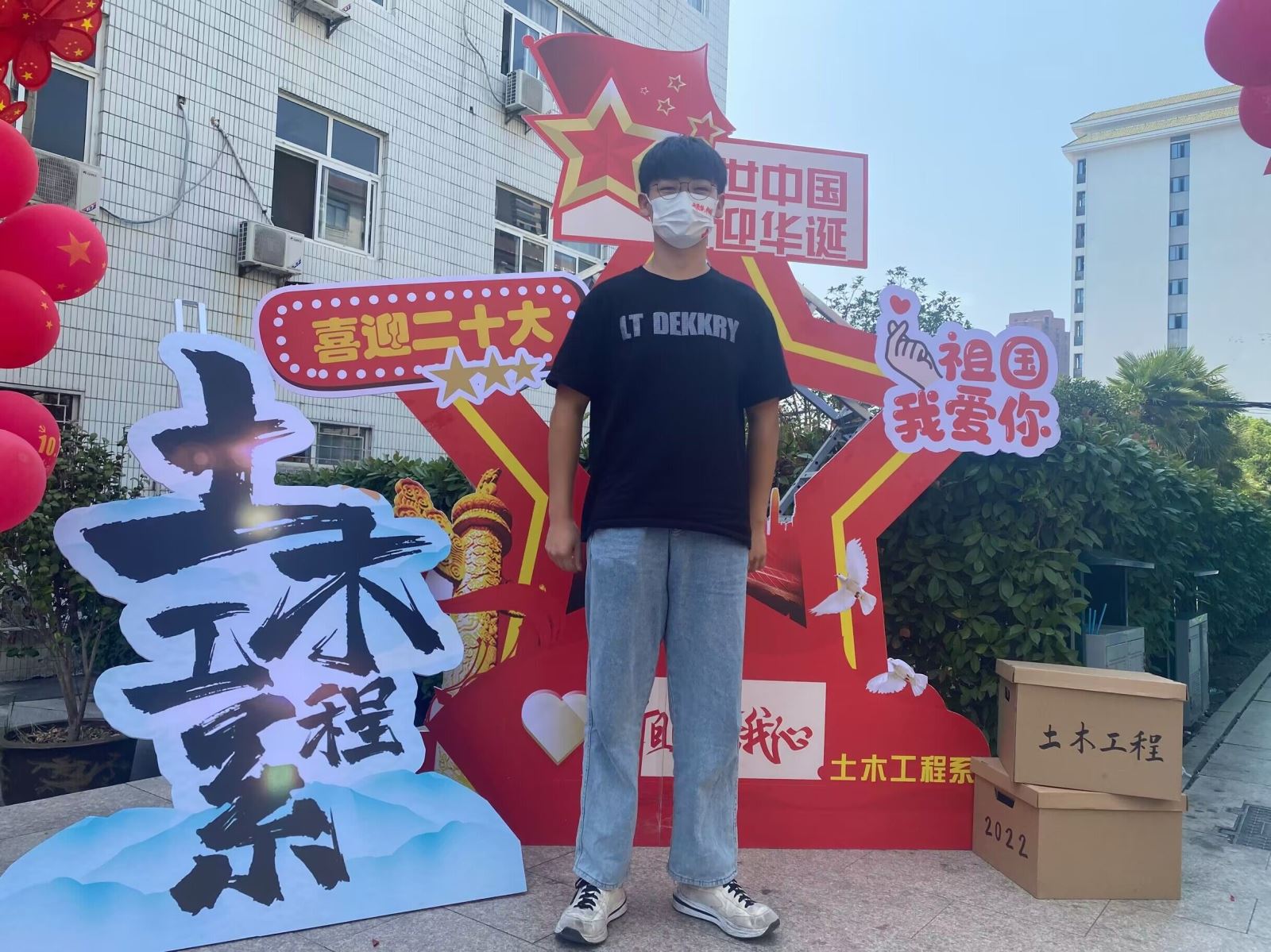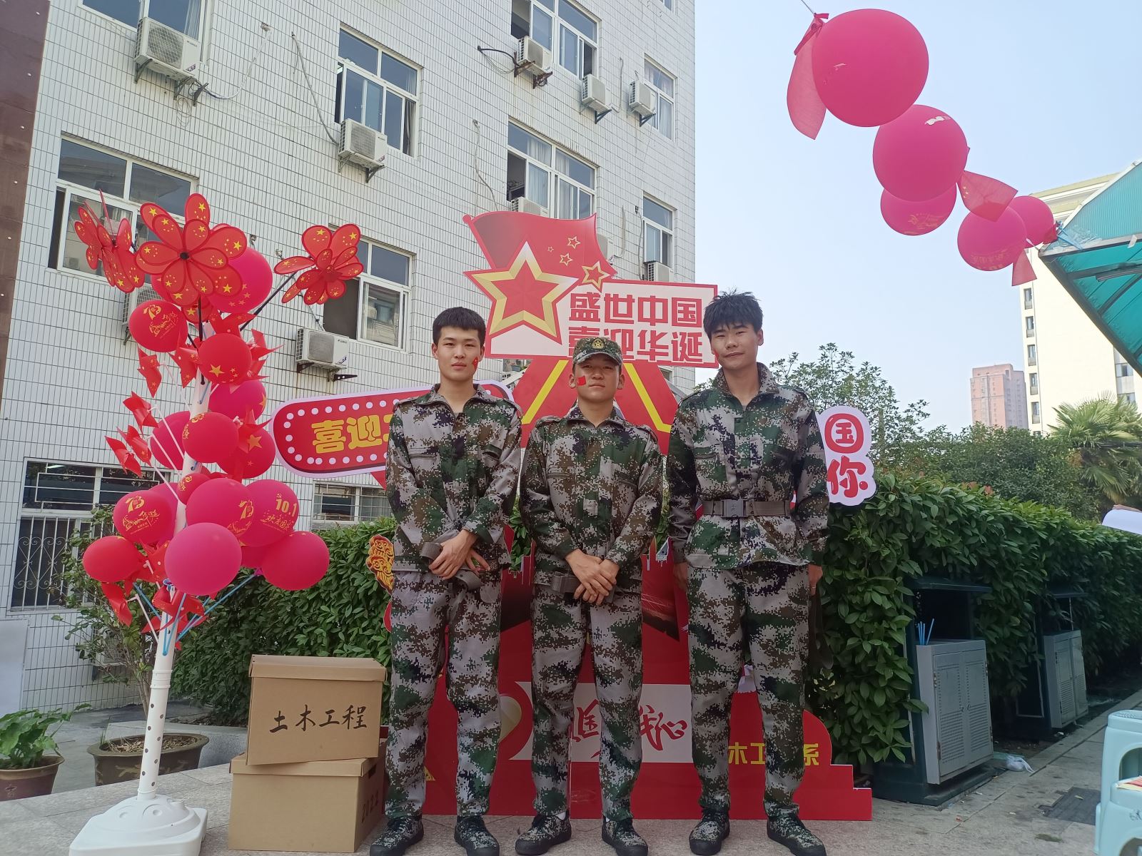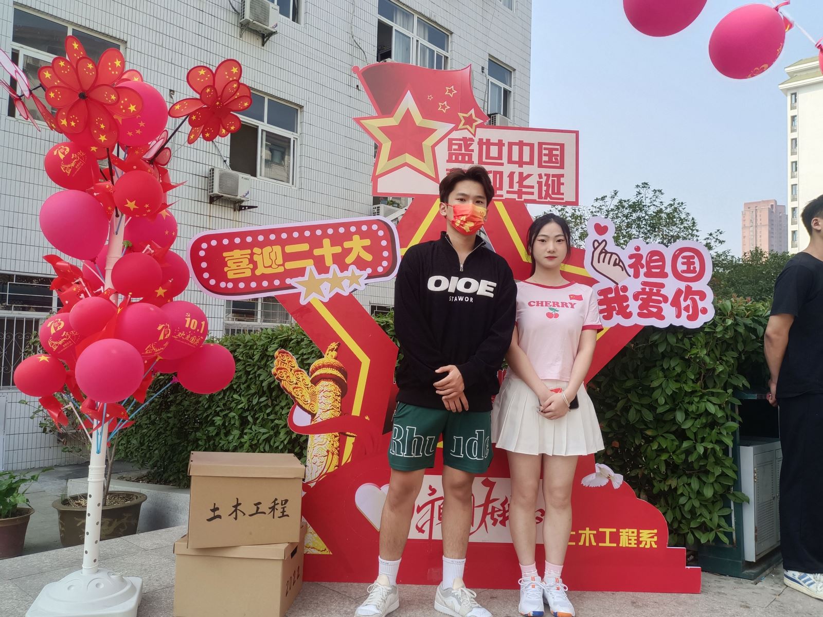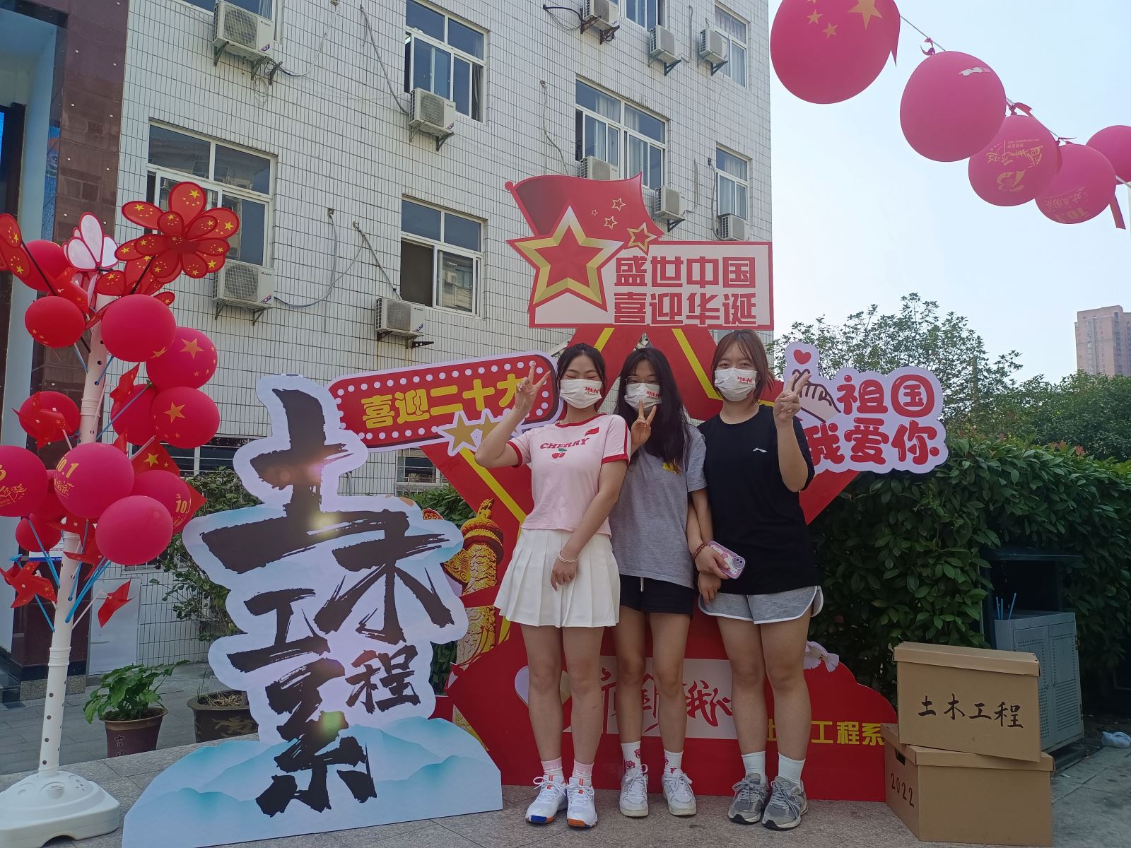 活动中,同学们热情高涨,将办公区和教学楼门前装扮成一片美丽的中国红海洋,以此表达对祖国母亲的无限热爱。“如果奇迹有颜色,那一定是中国红!”土木系团总支学生会志愿者王文欣举起手中的国旗气球开心的说道。“祖国如此繁盛强大,作为其中一员,我们尤为自豪!”“我们要用自己所学的土木专业,为祖国的建设添砖加瓦!”“请祖国放心,强国有我们!”土木系青年学子们在自信自豪的言语中展示出了青年一代的责任与担当,结束了军训汇演的22级新生们也积极参与,纷纷与活动立牌合影。