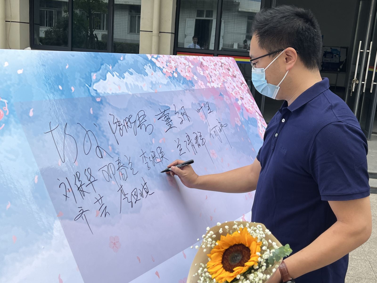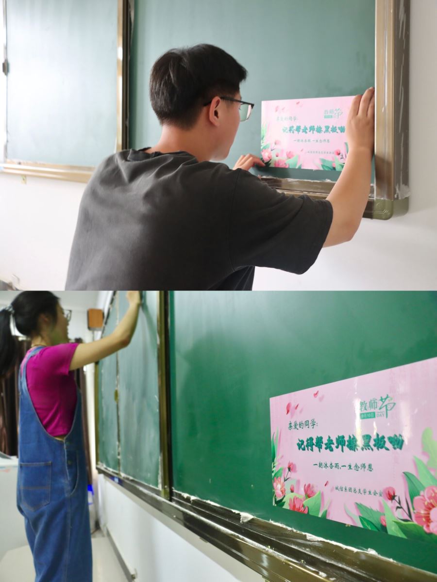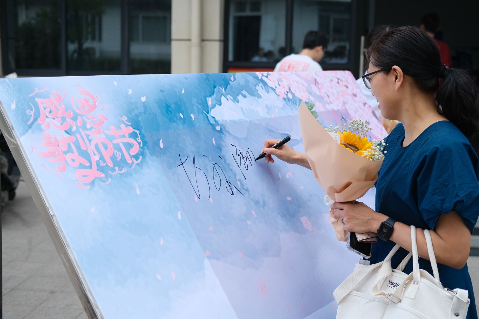 温暖人心的祝福语透过一张张卡片,那是同学们对老师们的祝福,对老师们情谊的诉说,一笔一划中厚植爱国情怀,涵养高尚品德。老师们也在祝福墙上留下签名、记录下最美的身影,师生同频共振,相得益彰。