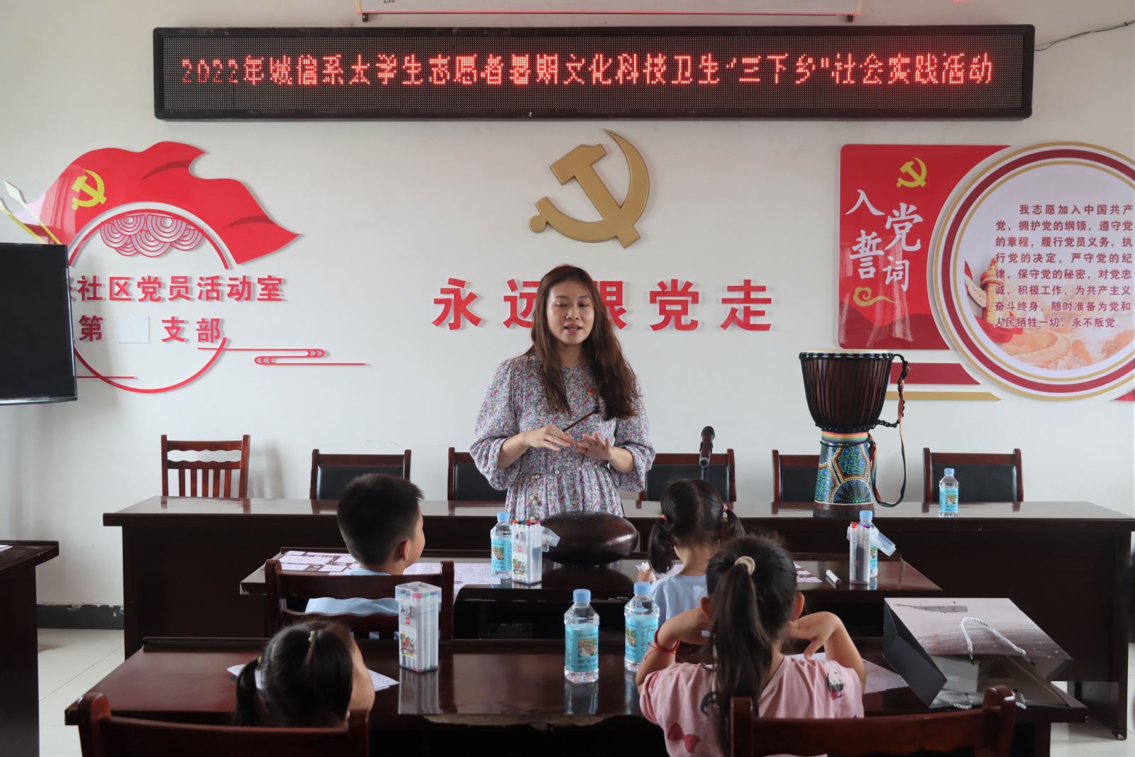艺术润心田,美育悟党史。为了让红色教育“深入童心”,植根爱国主义情怀,城信系先锋队来到了岭兴社区党群服务中心,以服务践行初心和使命。活动中,徐海霞老师给小朋友们开展“童心向党,喜迎二十大”的党史小课堂,通过喜闻乐见的多元化形式,让孩子们了解中国共产党的诞生,感受建党的艰辛历程,为培养儿童爱国主义情感奠定底蕴。童心向党,与党“童”行,周珺老师以“我爱我的祖国”为立意,带领小朋友们一起绘画,遇到难题和疑惑时,周珺老师便俯下身来细细讲解,小朋友豁然开朗,相视一笑。李思琪老师则是带着才艺而来,先后给小朋友们展示空灵鼓、非洲鼓的由来,科普乐器知识,最后亲自表演了由空灵鼓演奏的《大鱼海棠》,美育启智,同心筑梦。