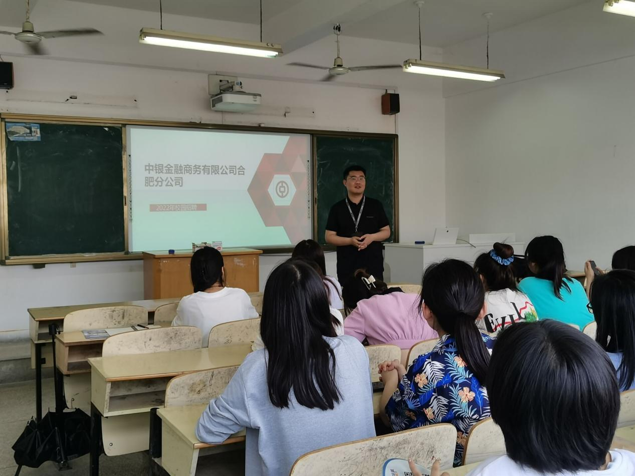 中银金融商务有限公司、安徽联新科技有限公司、合肥崇伍科技有限公司、安徽邻几便利店有限公司、芜湖派睿电子商务有限公司等5家企业受邀来校进行了宣讲。各家企业主要通过讲解、播放PPT宣传片、发放校园招聘宣传册等方式,详细地向同学们介绍了公司的发展历史,组织架构,办公环境,福利制度和人才培养机制等内容,并解答了学生关心的后续就业问题。