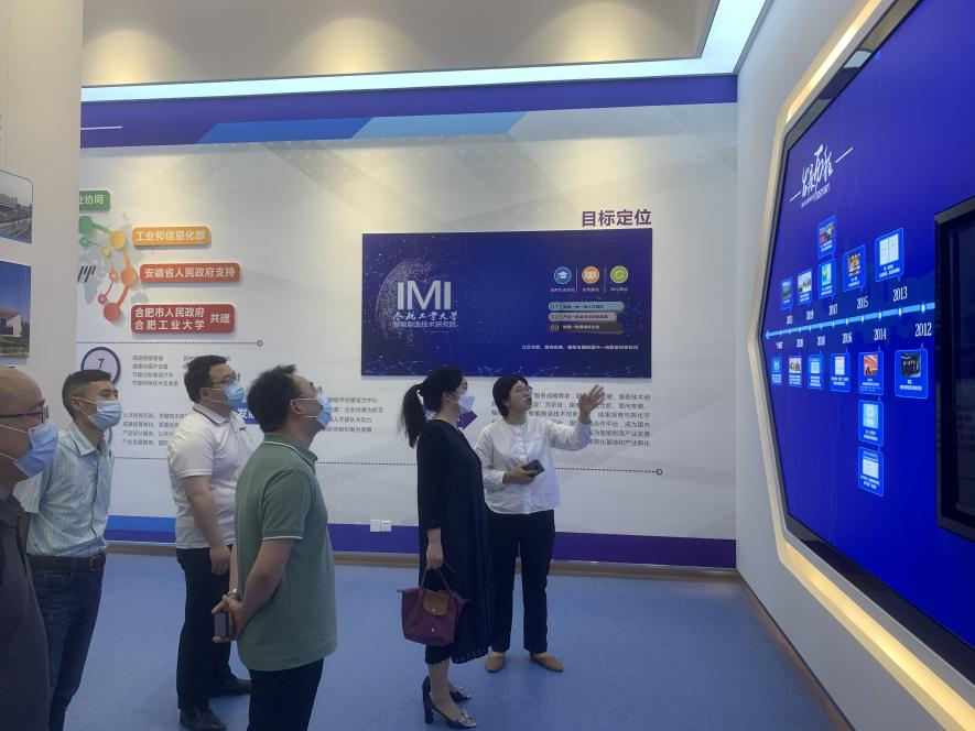 梁洪波一行在甄圣超及张钊等人的带领下参观了合工大智能院展厅及机器人/智能制造公共创新服务平台。