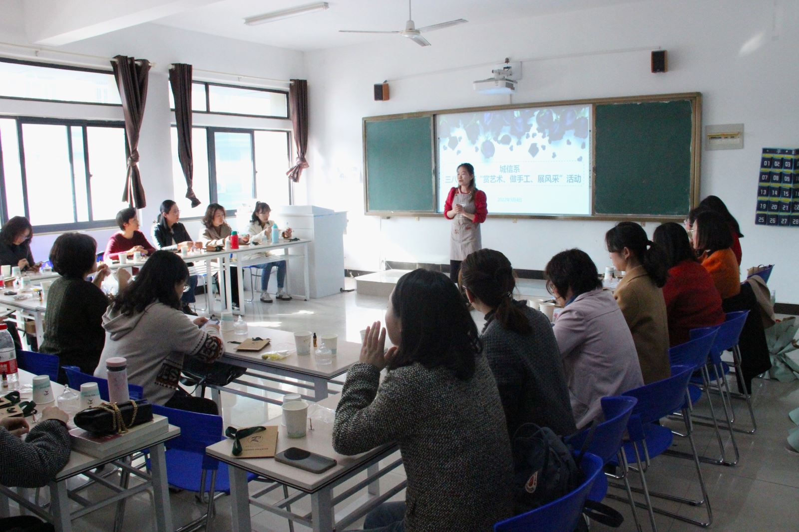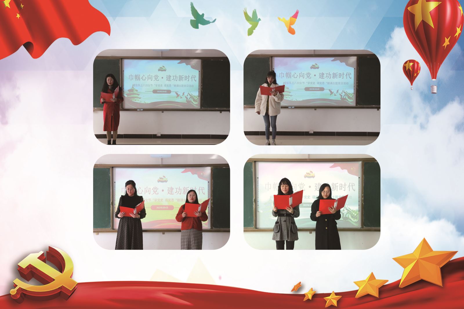 3月4日下午,为深入学习贯彻习近平新时代中国特色社会主义思想,深入开展党史学习教育,在“三八”国际劳动妇女节到来之际,城信系举办“学党史·颂党恩”朗诵主题党日活动暨手工体验活动,系全体女教职工参加。
