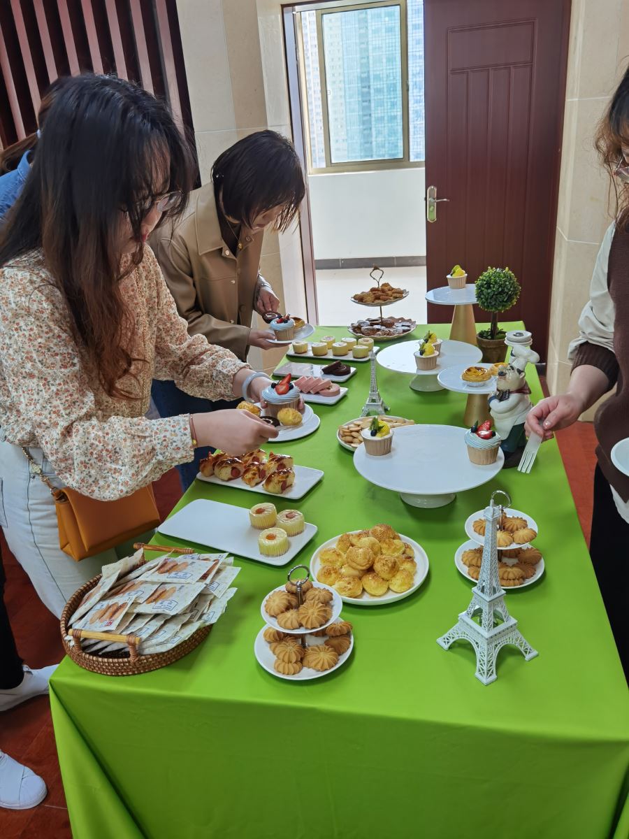 活动现场一派热闹景象,气氛十分活跃。女教职工们兴致勃勃,纷纷挑选自己喜欢的图样,在老师的指导下,大家跟随自己对美的见解,选择自己喜欢的色彩,对着手中的麻布袋涂涂画画,她们认真的眉眼中闪烁着自信、快乐的光芒,举手投足间全是新时代女性自立自强的气质。在她们手中的麻布袋逐渐变得出彩,一件件富有创意、独一无二的包包慢慢诞生了。DIY手绘之余,大家纷纷品尝烘焙甜品,每个人脸上洋溢着幸福甜蜜的灿烂笑容,纷纷表示“今天的活动非常治愈解压,让大家享受了一次美的洗礼。”