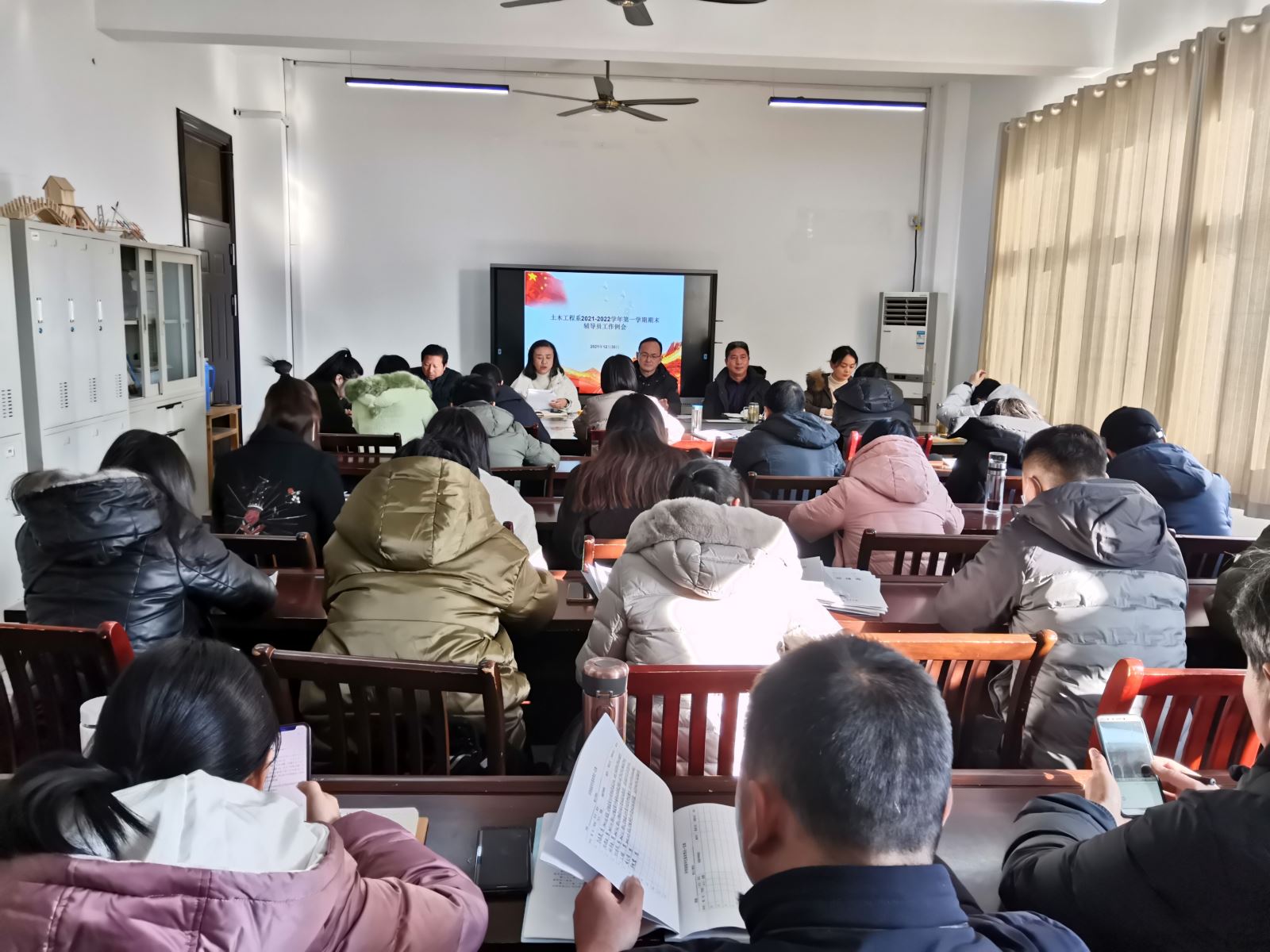 12月30日下午,土木系在系会议室召开本学期期末辅导员工作会议,系党总支书记邹建华、副主任王东、副书记朱蓉、副主任王守胜以及全体辅导员参加。