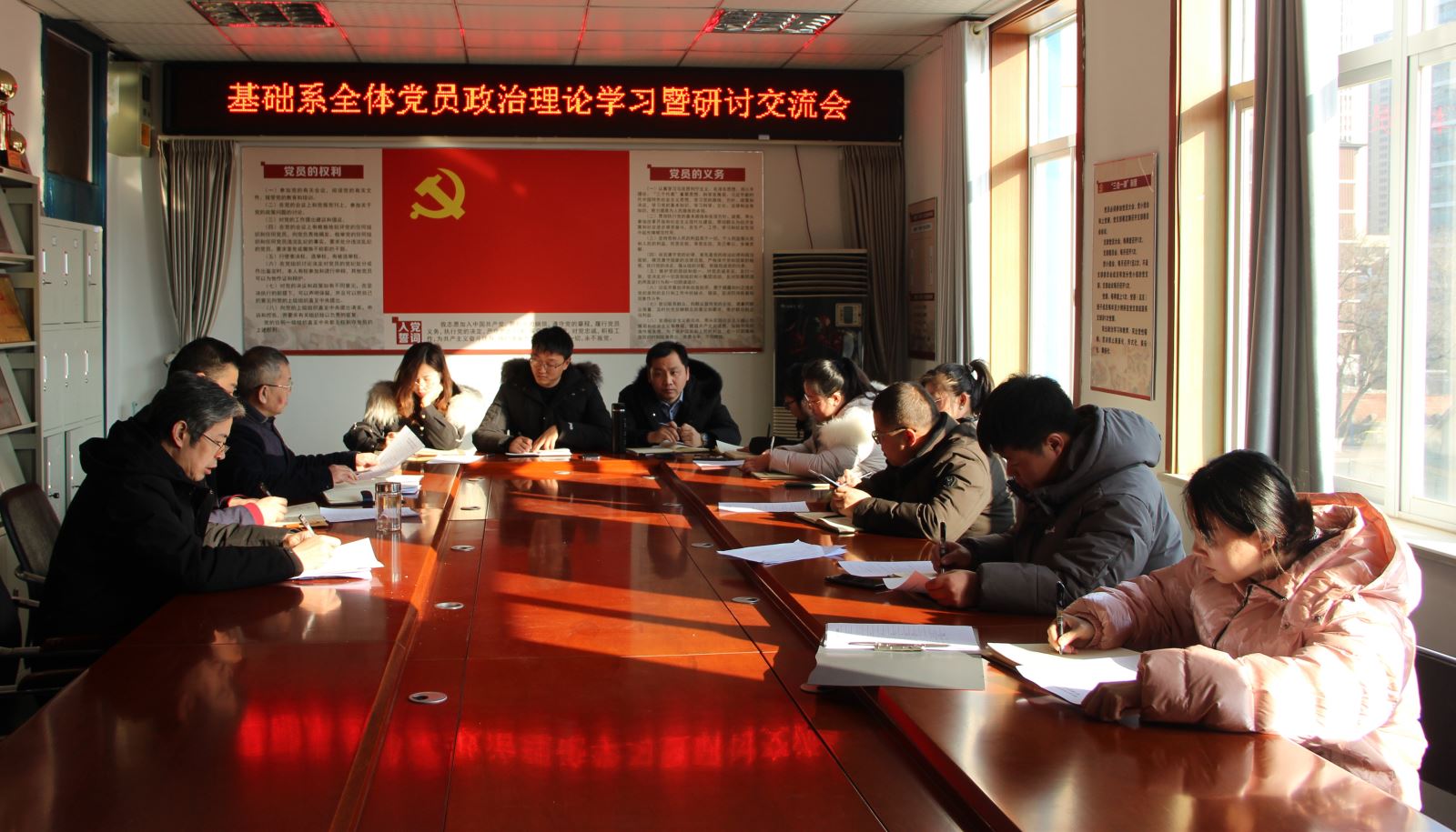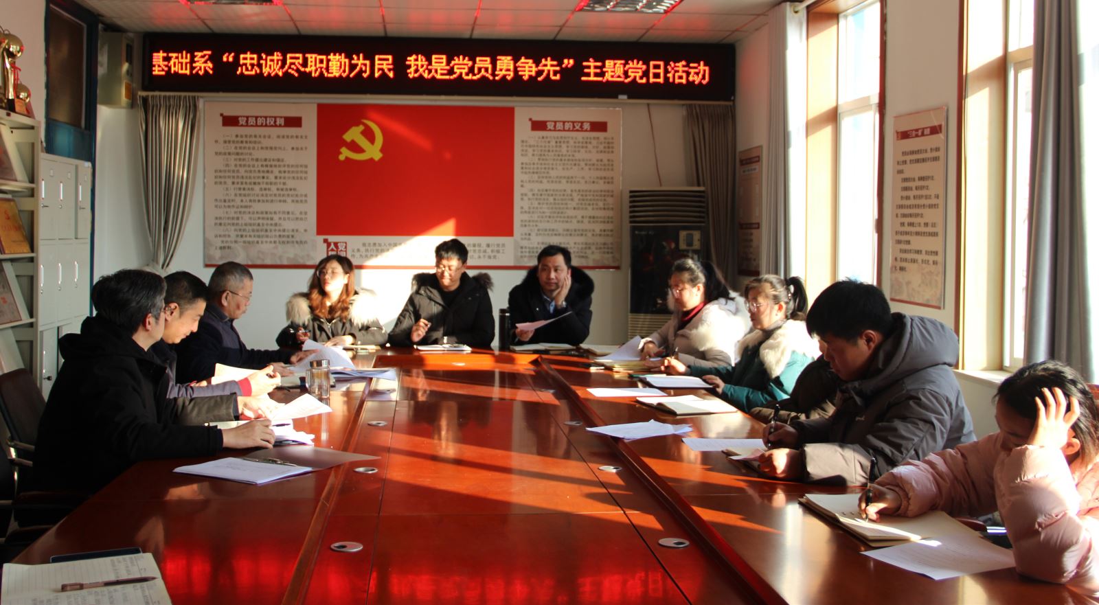 为深入学习宣传贯彻党的十九届六中全会精神、省第十一次党代会精神,推动会议精神入脑入心、落地见效,12月29日,基础系党总支开展主题党日活动,围绕“忠诚尽职勤为民,我是党员勇争先”开展大学习大讨论活动。基础系党总支书记邵登泰主持,全体党员参加。