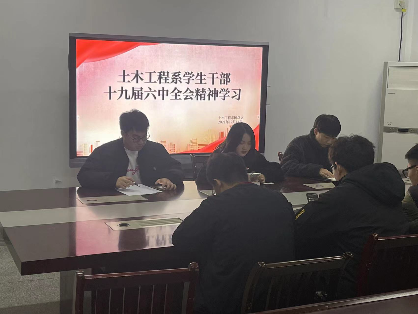会上,三位新任主席带领全体学生会干部学习了党的十九届六中全会精神并组织研讨。随后武庆媛进行了全会精神的学习指导和总结,对重点细节进行补充,帮助学生干部门更加充分的学习党的十九届六中全会精神。