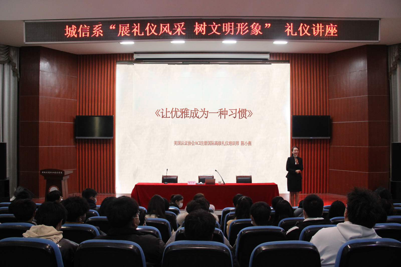 “人无礼则不立,事无礼则不成,国无礼则不宁”。为增强学生文明礼仪修养,全面提升学生的综合素质,城信系于12月1日晚特邀美国认证协会ACI注册国际高级礼仪培训师陈小燕在学院八角楼开展礼仪讲座,系20、21级学生代表参加讲座。