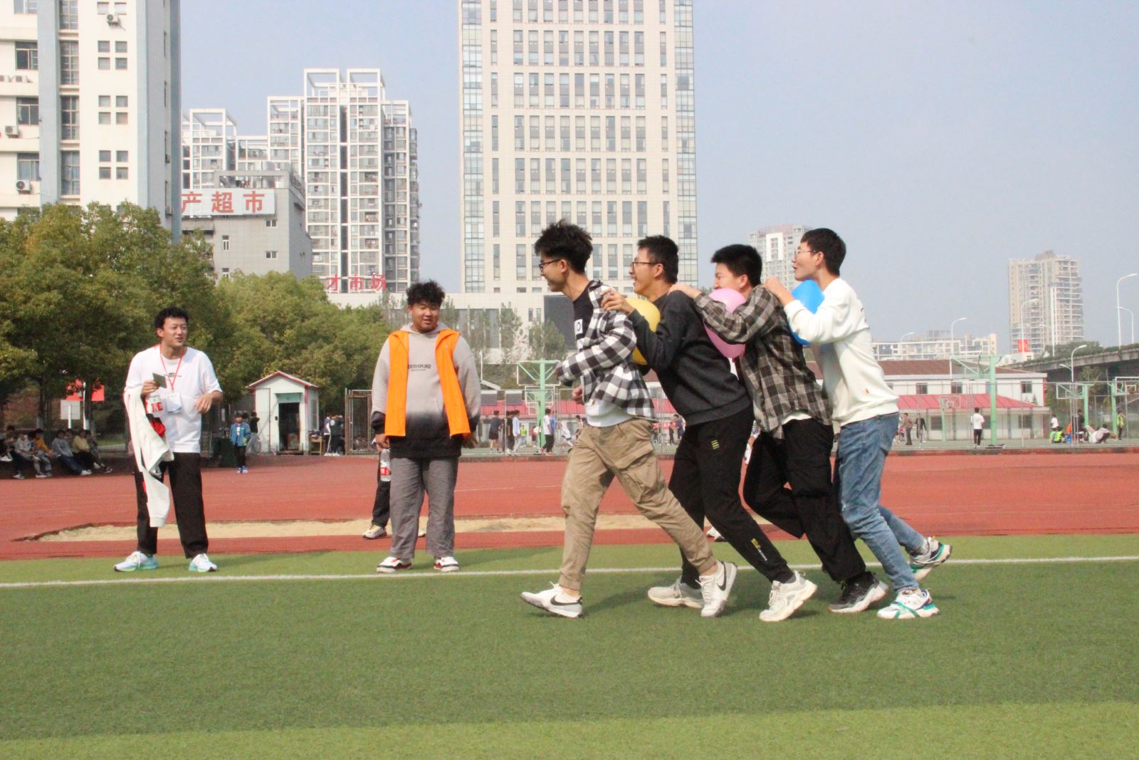 在五人六足赛场上,各组队员齐心协力一个劲儿的向前“奔”,有的队伍重心不稳,“一人不慎,四人全倒”,引得全场笑声一片。