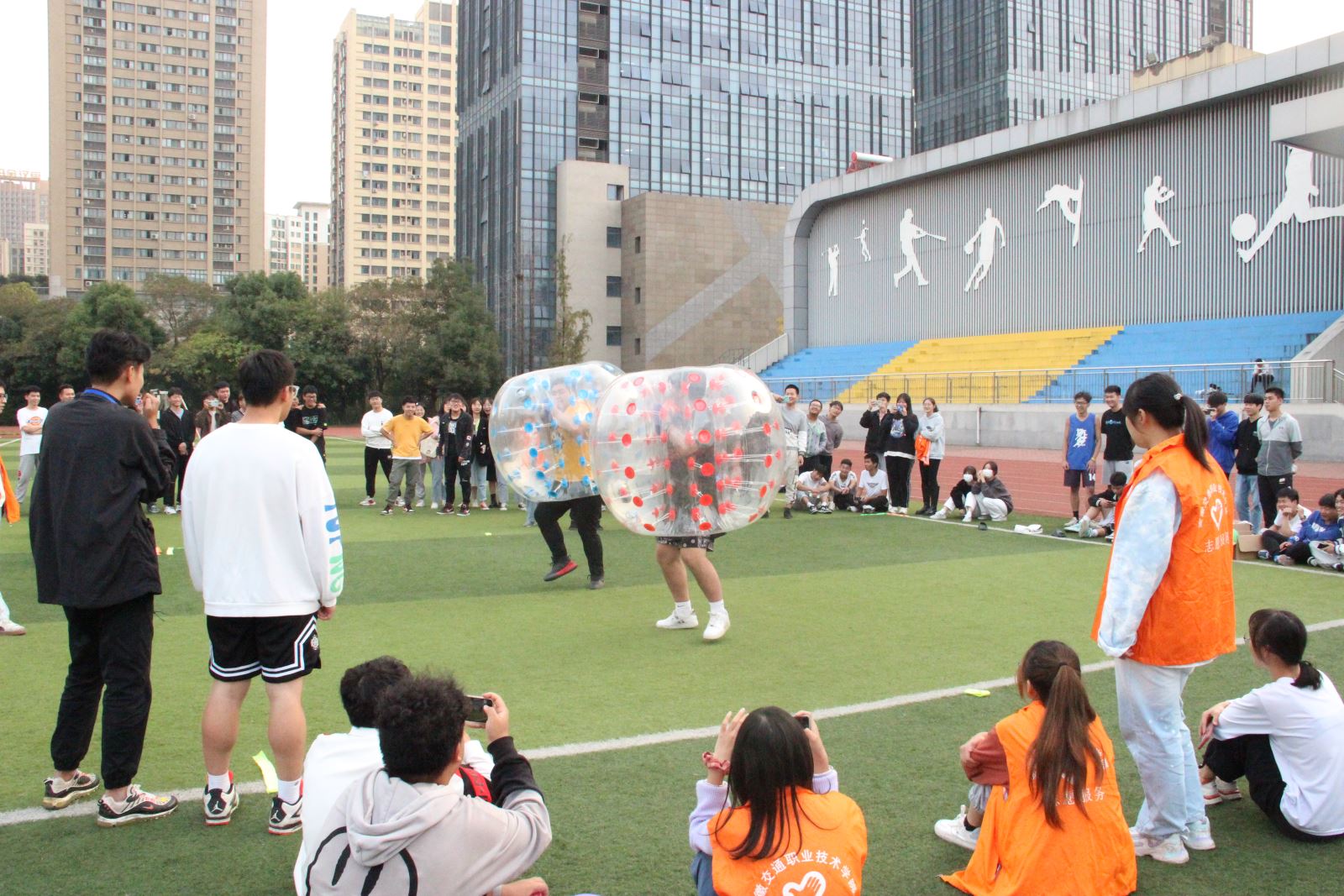 伴随着比赛的进行,紧张激烈的场景吸引了众多师生前来观看。最后的激情碰撞比赛中随着场下队友及观众的鼓励,场面十分热闹,整个操场布满了同学们的笑声,工作人员也记录着每场比赛的精彩瞬间。