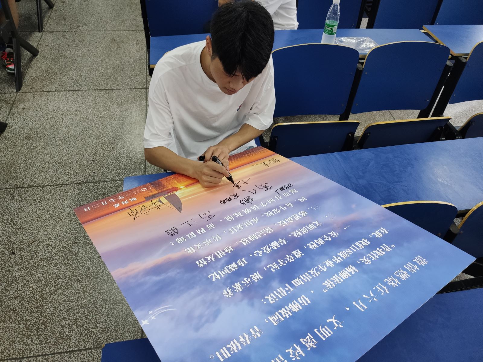 各位学生在文明离校展板上签下名字,倡议安全离校,遵章守纪,展示素养;文明离校,奉献爱心,珍藏回忆;感恩离校,铭记师恩,珍惜友情;奋斗离校,承担责任,传承文化。