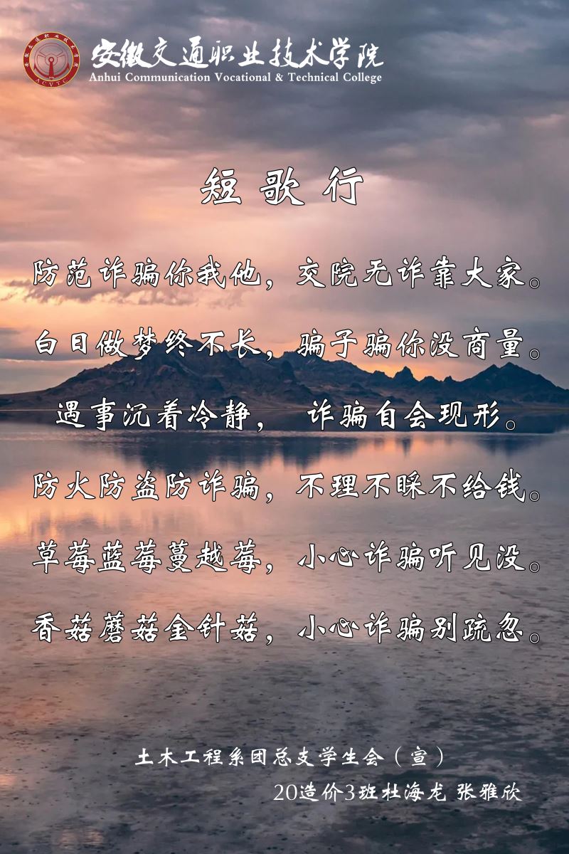5月21日至5月23日,系学生会将征集到的作品进行综合评分,其中20路桥3班、20路桥4班、19造价2班和20造价3班的作品表现突出。同时,土木系生活部还拍摄了原创微视频,内容贴近学生实际,将预防诈骗知识融入了学生生活点滴之中,更易让学生接受,金融风险防意识入心、入脑。
