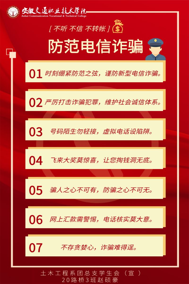 网络防诈骗作品征集活动:5月18日晚自习,由土木系生活部组织开展了防诈骗宣传作品征集活动,作品内容为:防诈骗主题的标语、宣传海报、短视频等。