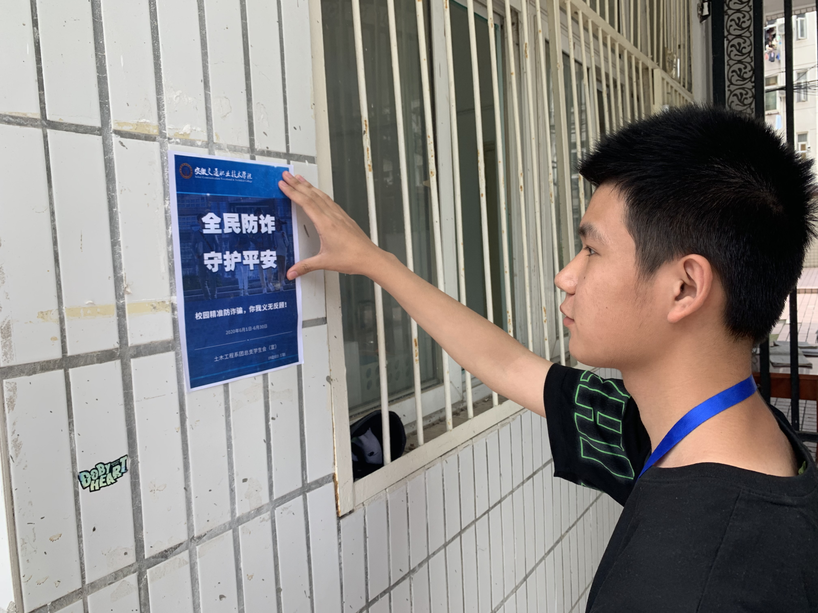 将征集到的优秀作品打印出来展示在教学楼前,并将防诈骗宣传海报张贴在各宿舍楼下,对过往的同学们进行防诈骗知识宣传。
