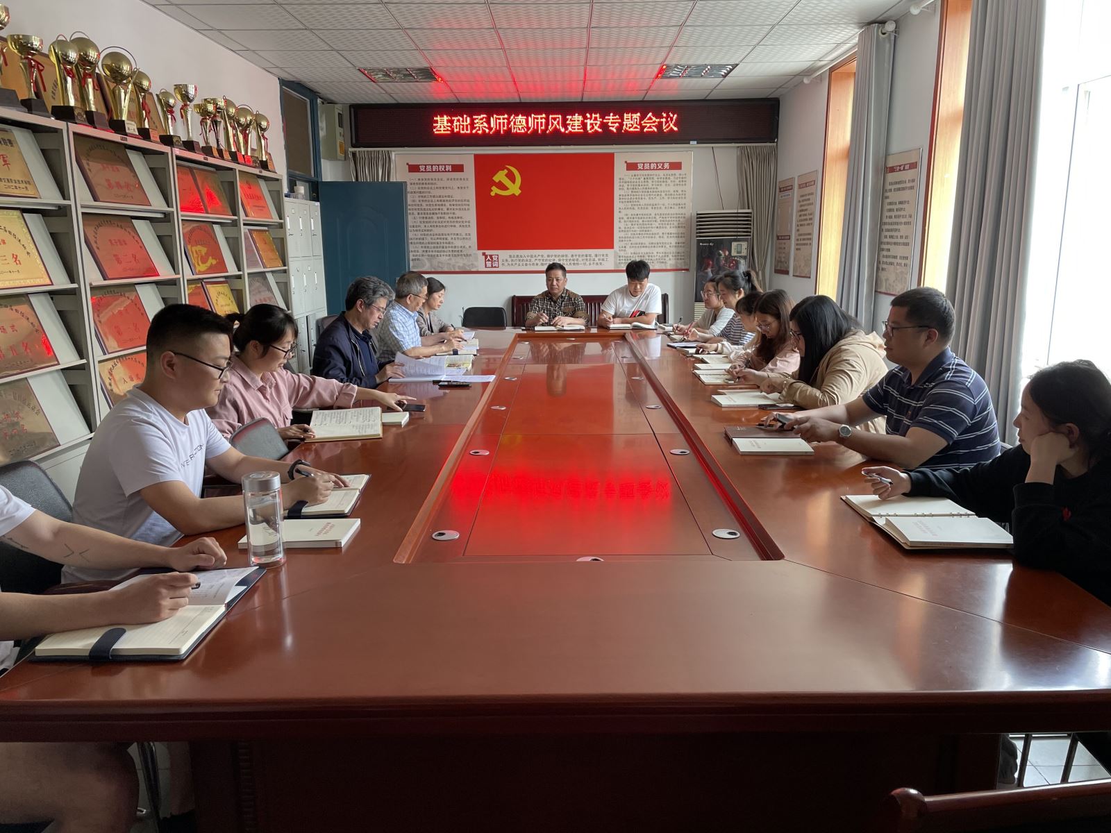 会议布置了基础系近期师德师风建设工作的重点:学习《教师法》、《习近平总书记教育重要论述讲义》、宣传学院及基础系优秀教师、优秀辅导员先进事迹及学院政治生态修复工作等。