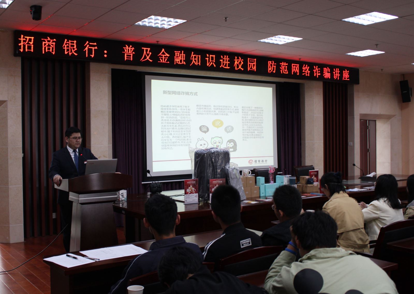 为进一步加大校园防诈骗宣传力度,普及反诈知识,增强防范意识,营造平安和谐的校园环境,4月21日下午,学院联合合肥市招商银行在信息楼9楼举行“普及金融知识进校园,防范网络诈骗”专题讲座。讲座由学院保卫处处长袁大方主持,招商银行宣教讲师进行宣讲。学院各系师生代表及辖区望湖派出所民警参加了本次讲座。