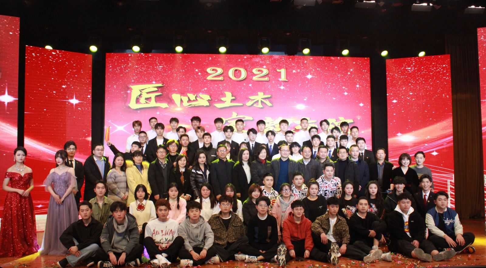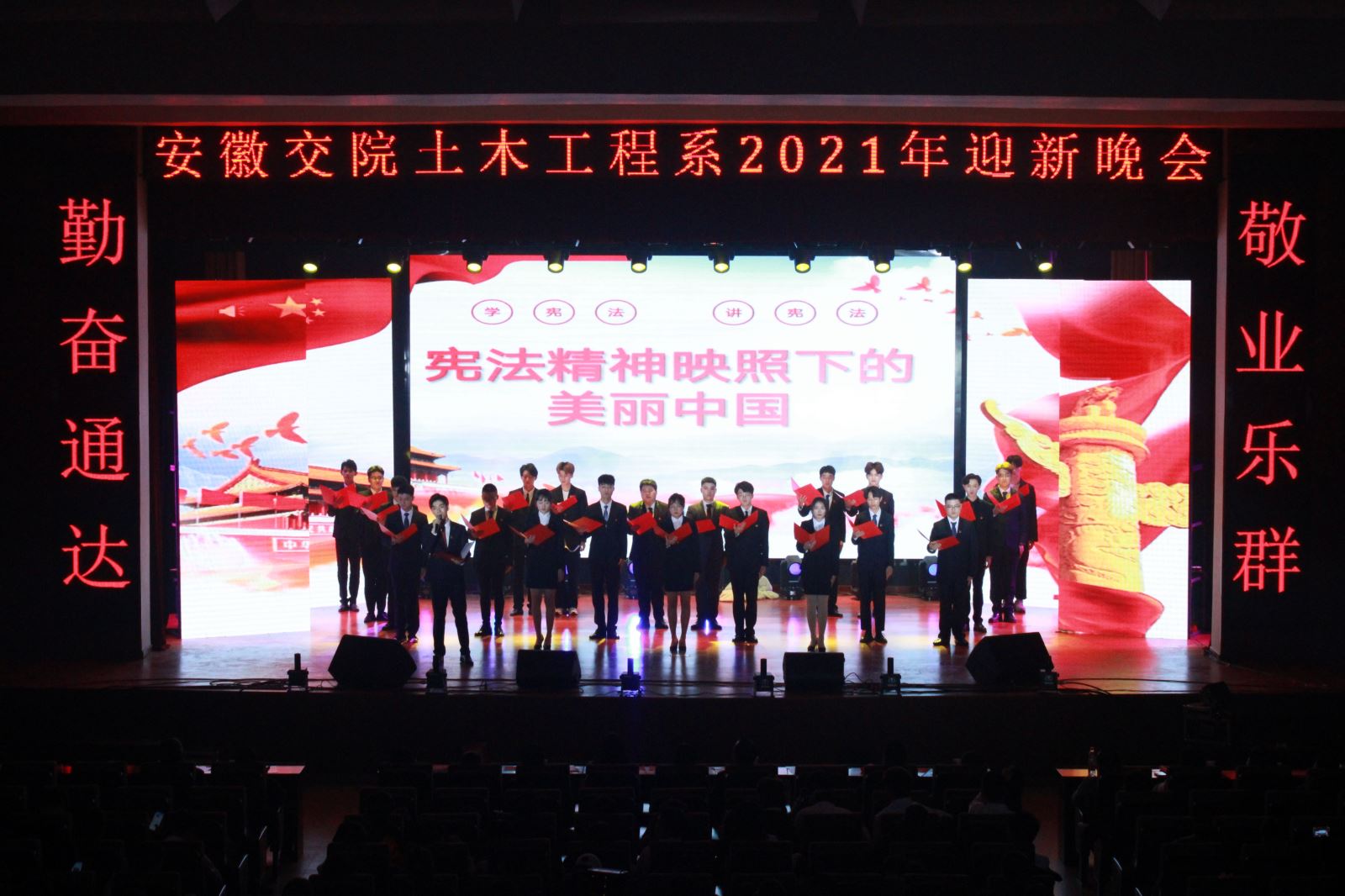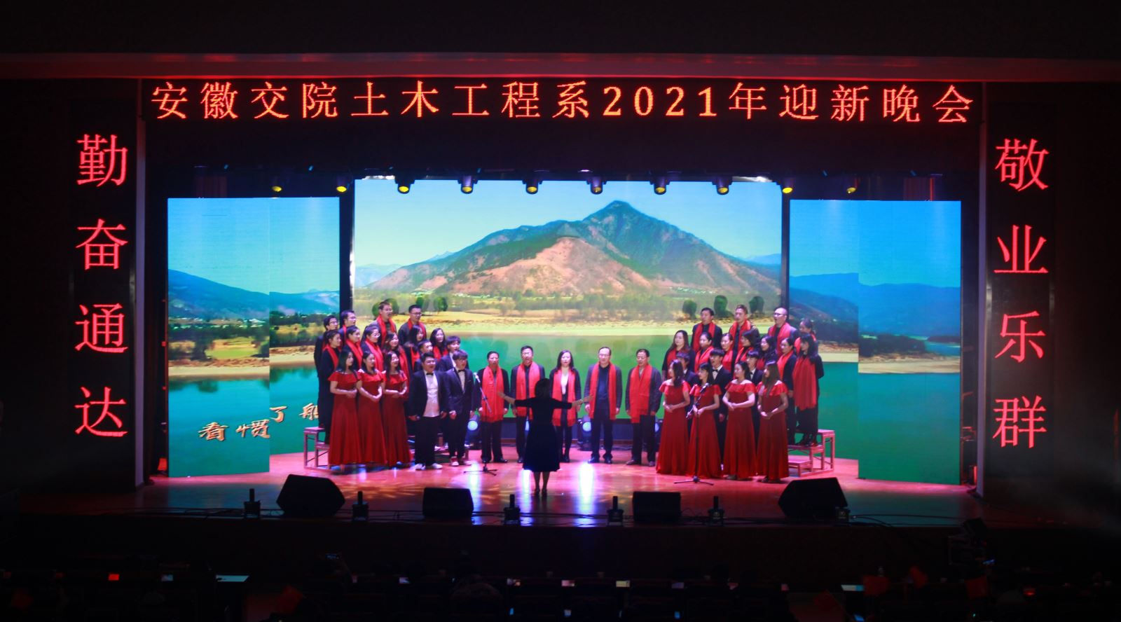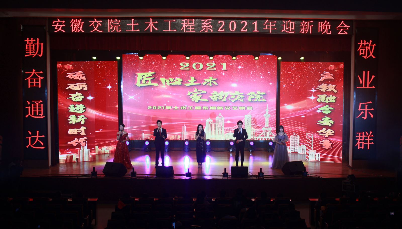 12月28日晚,土木工程系2021年元旦师生联欢会在南区大礼堂成功举行。土木工程系党总支书记邹建华、党总支副书记、主任王常才、成教部主任李扬、系党总支副书记朱蓉、副主任肖玉德、王守胜,以及安徽路桥集团检测公司副总经理佐群、办公室主任张鹏、人力资源部部长黄玲玲,安徽新路集团人力资源部部长魏静、安徽开源路桥公司人力资源部经理张奇、安徽水安集团人力资源部部长章天意、黄山新洲集团副总经理李小龙、安徽交建股份公司人力资源部部长沈艳军、高速监理公司工会主席刘丙军等合作企业代表,与数百名师生一道观看了演出。晚会由安徽天鹭控股集团党支部书记、经营总裁曹家云女士与我系学生共同主持。此次联欢会由土木工程系团总支主办,系学生会承办。
