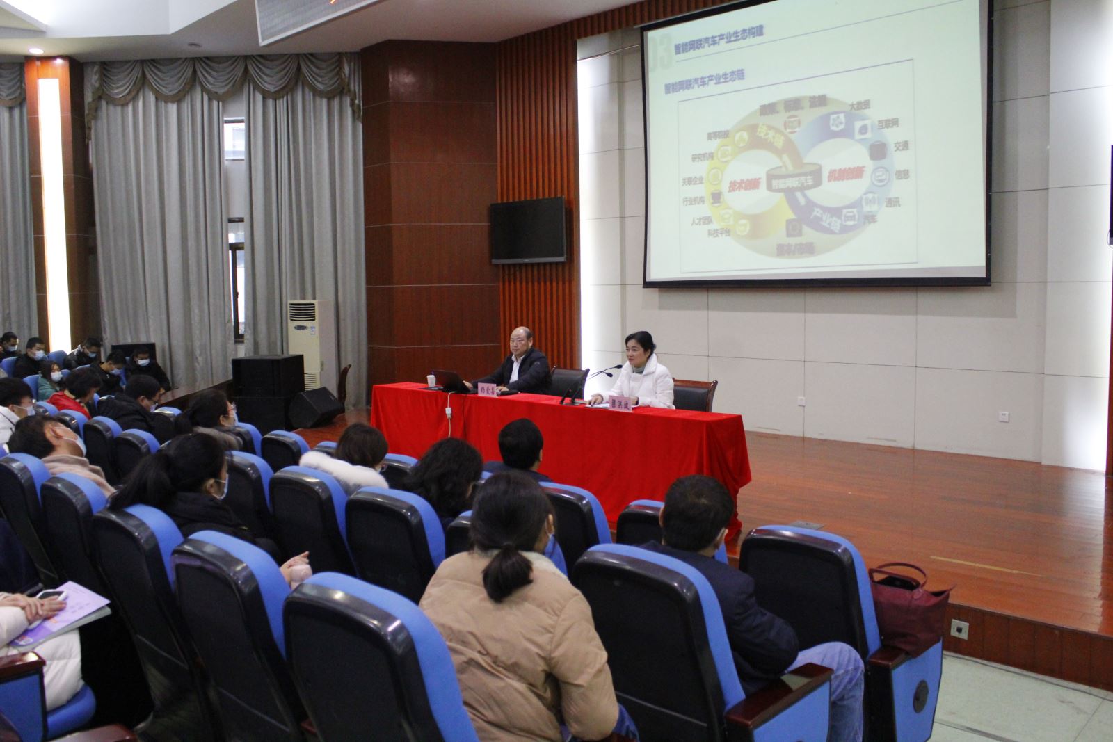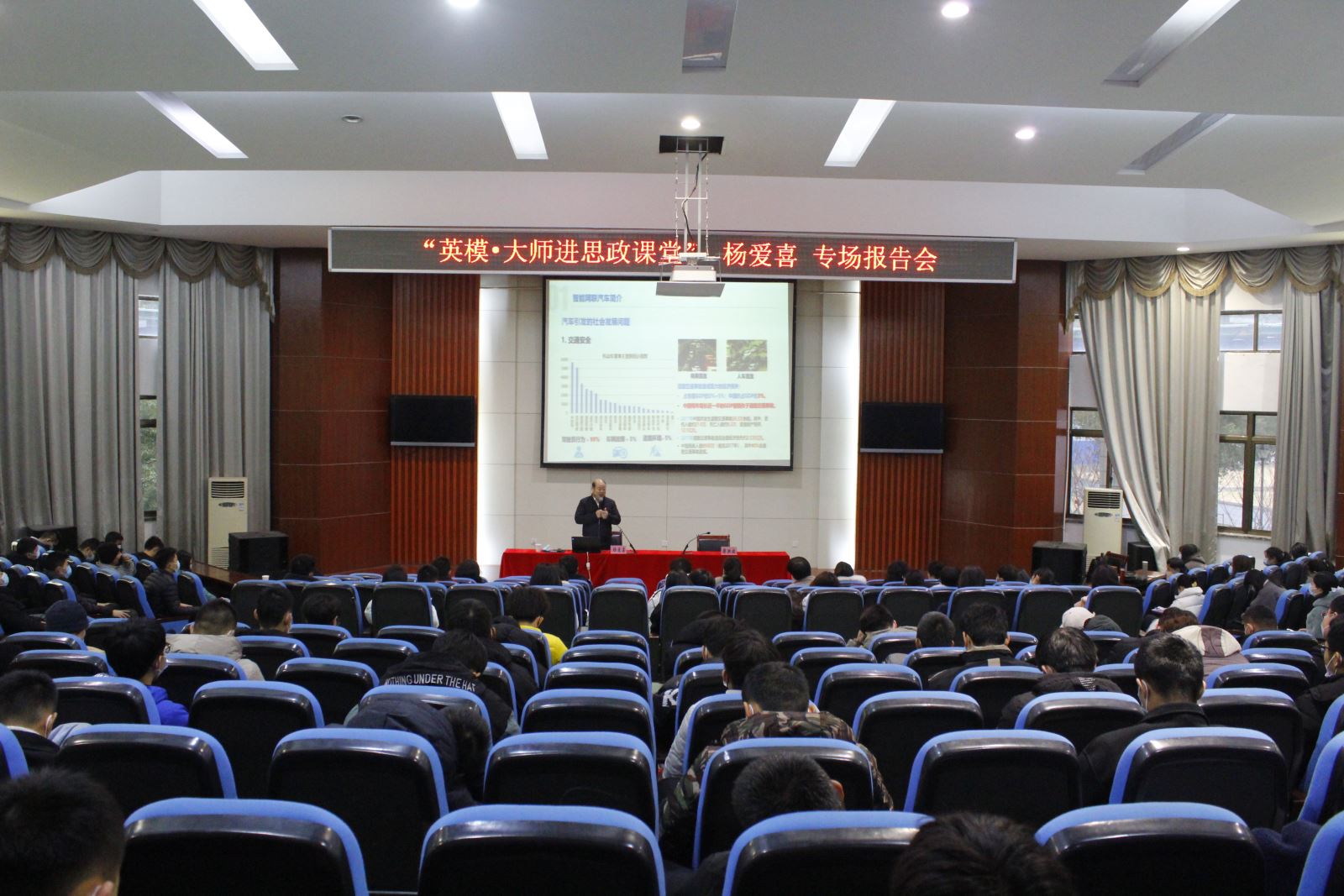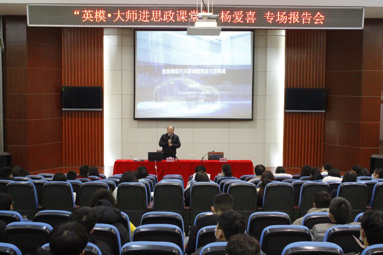 为发挥新时代先进人物的榜样示范作用,12月29日,汽车与机械工程系举办“英模·大师进思政课堂”主题报告会。特邀国务院特殊津贴专家、正高级工程师、高级经济师,现任浙江省智能网联汽车创新中心总经理、浙江大学工程师学院兼任研究员、浙江省发改委和经信厅专家库专家、浙江省新能源汽车标准化技术委员会副主任委员、浙江省新能源汽车产业联盟专家委副主任委员杨爱喜大师作专题报告。系党总支书记李家林、党总支副书记、主任梁洪波、文理科学系党总支副书记、副主任王珏出席报告会。汽机系、文理系200余名师生聆听了报告。报告会由梁洪波主持。