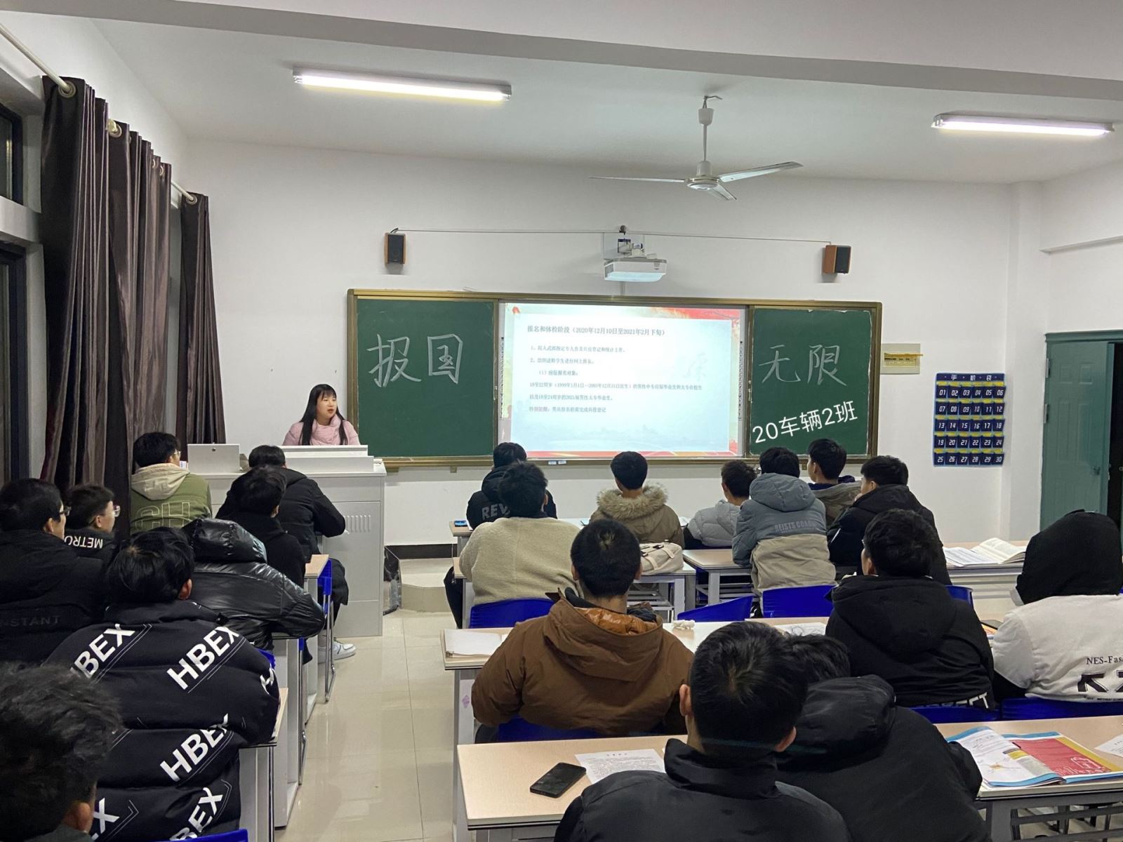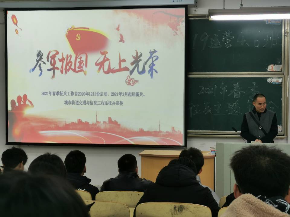 为进一步做好2021年春季征兵宣传工作,城市轨道交通与信息工程系严格按照《米兰milan官方网站2021年春季征兵工作实施方案》的相关要求,精心部署,明确责任,规定时间节点,细化落实举措,结合2018、2019、2020级学生实际,系里统一制作了“参军报国·无上光荣”主题班会PPT,精心设计了《网络在线学生参军意向情况调查表》。组织全系各年级辅导员通过线上、线下等多种方式于1月8日前使用统一PPT全部召开了征兵宣传主题班会,并组织全体学生在线填写了《网络在线学生参军意向情况调查表》,及时统计学生征兵入伍意向,了解学生征兵入伍思想动态,实时统计有意向当兵入伍的学生,给予追踪指导。