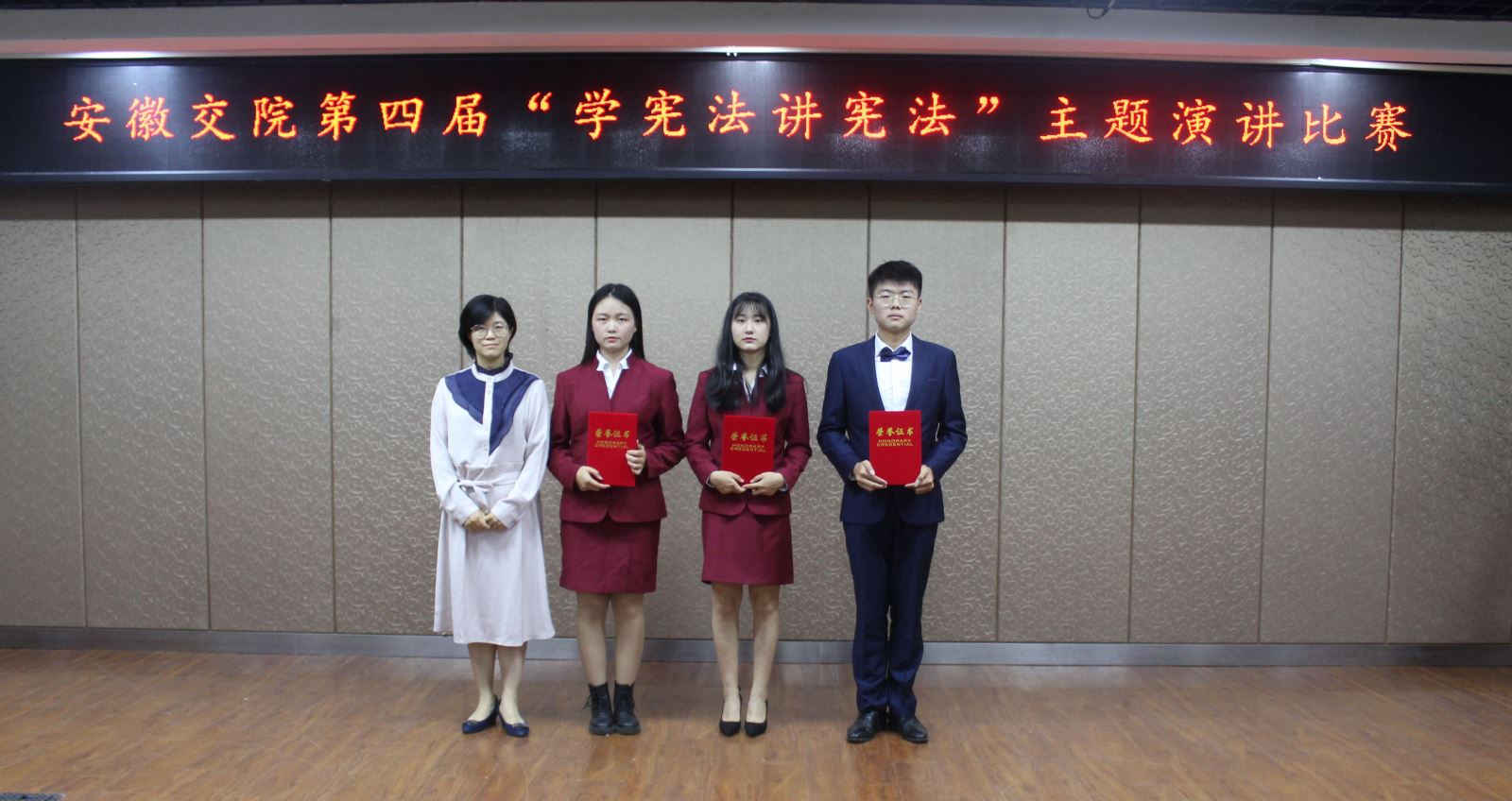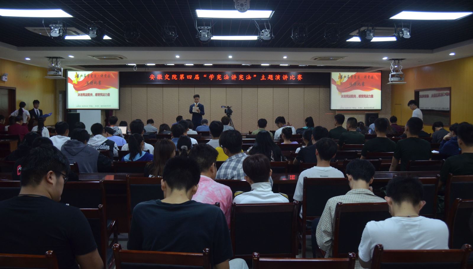 沐浴宪法阳光,感受宪法力量。9月24日晚,由院学生处(团委)主办,院学生会学习部承办的第四届“学宪法讲宪法”主题演讲比赛在北区大学生活动中心举办。院团委书记肖虹,文理科学系副教授吕中国,文理科学系副教授孔令斌,学生处王萌钰老师及来自各系的百余名学生共同观看了比赛。