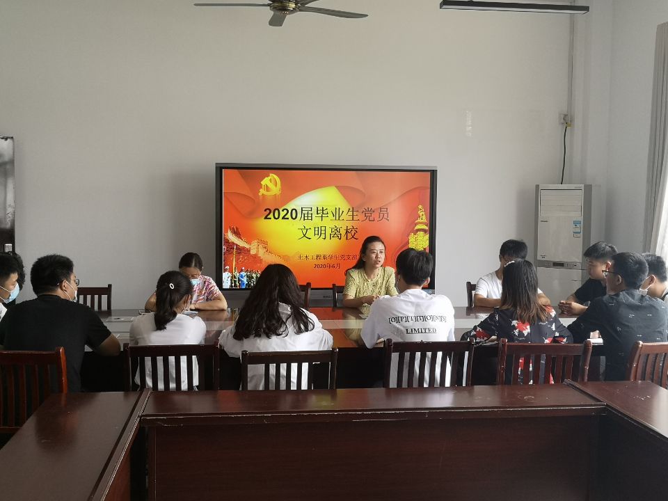 6月29日,毕业生返校当日,土木工程系采用多种形式,加强毕业生爱党爱校及文明离校教育。组织毕业生党员教育活动,学生党支部书记汪爱娥老师以“坚定理想信念,做新时代合格党员”为学生党员讲党课,号召毕业生党员牢记党员身份和使命,组织贷款毕业生代表开展“助学贷款诚信教育”,引导毕业生认真履行还款义务,争做诚信的典范。土木系积极协调院财务处、图书馆、保卫处等部门帮助毕业生快速办理离校手续,最大化为毕业生提供保障服务,给毕业生留下了温馨、美好的毕业回忆。