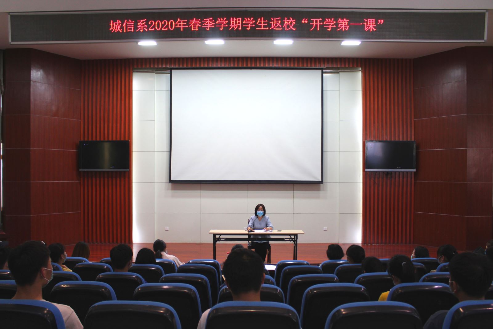 5月19日下午,系党总支书记汪倩在学院北区八角楼多功能报告厅给全体返校班级学生上了2020年春季学期学生返校“开学第一课”,系学管办老师、校企合作学工老师以及全体返校班级学生代表参加了开学第一课,汪倩就疫情防控下如何完成学业等多个角度给同学们提出了要增强学习能力、实践能力、幸福能力等要求,教育引导全系学生自觉担当新时代大学生的历史使命。(城信系 杨玉菡)