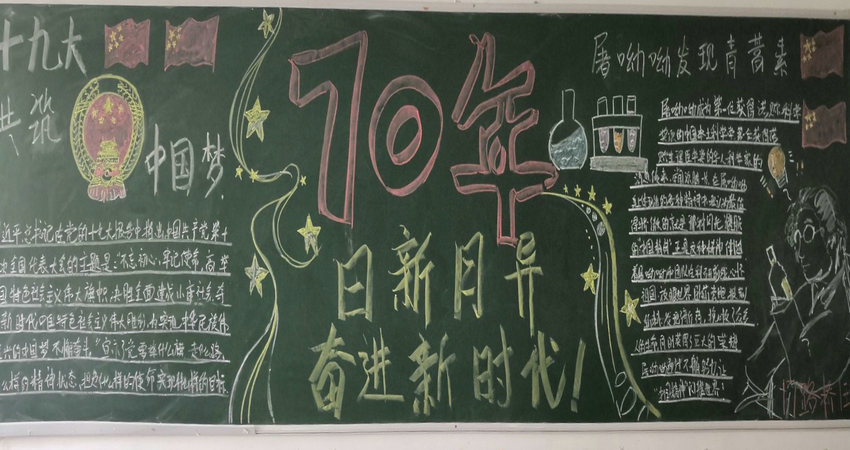 为庆祝新中国成立70周年,大力弘扬以爱国主义为核心的伟大民族精神,基础系十月份开展主题团日活动,以出板报、讲板报、评板报的形式,开展丰富多彩的主题宣传教育活动。
