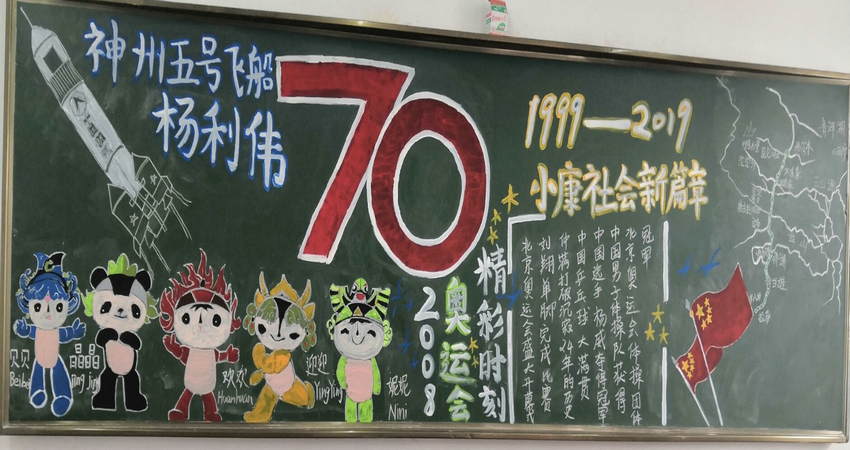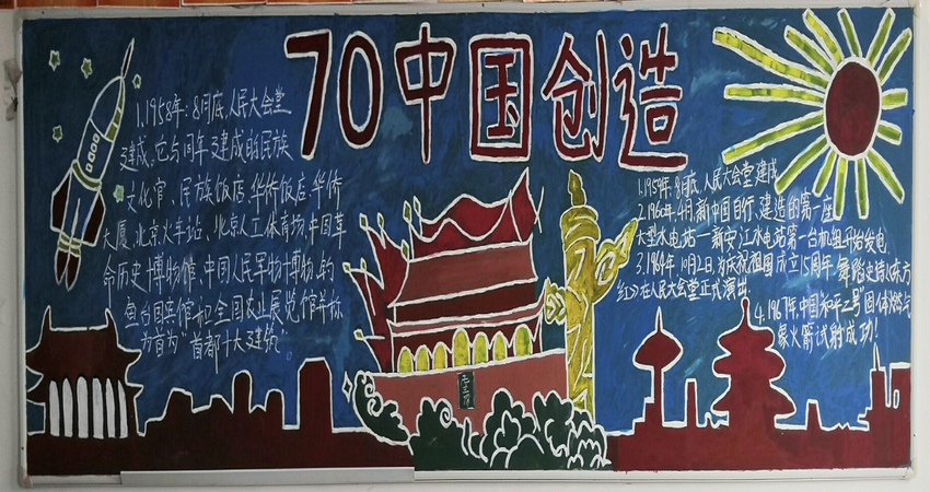 在基础系团总支的统一安排下,七个班级分别以十年为一个节点,出版主题板报,形成系列板报,齐心协力书写对祖国的热爱。学生们在方寸之间,以凝练的语言和朴实的图画记录新中国一路走来的风雨和成就。两弹一星、改革开放、港澳回归、“嫦娥”探月、“蛟龙”入海、“辽宁”入列……学生们在条件有限的情况下,一笔一画地展示出了祖国取得的傲人成就,合成了一幅壮丽的新中国图景。