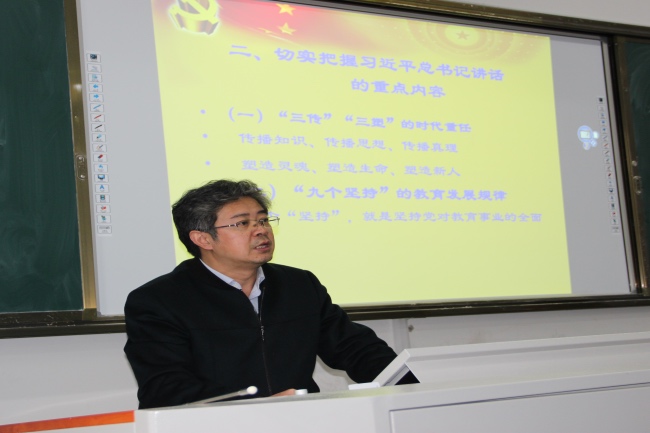 邵登泰从深刻领会全国教育大会重要意义、切实把握习近平总书记讲话的重点内容、完善职业教育体系,扎实做好中高职衔接工作三个层面展开宣讲,并结合基础系教学工作实际提出六项重点工作,即明确培养目标,做好中高职方向衔接;合理设置专业,做好中高职专业衔接;强化课程体系,做好中高职教学衔接;提升教师队伍,做好中高职师资衔接;拓展办学模式,做好中高职招生衔接;加强学生工作,做好中高职管理衔接。