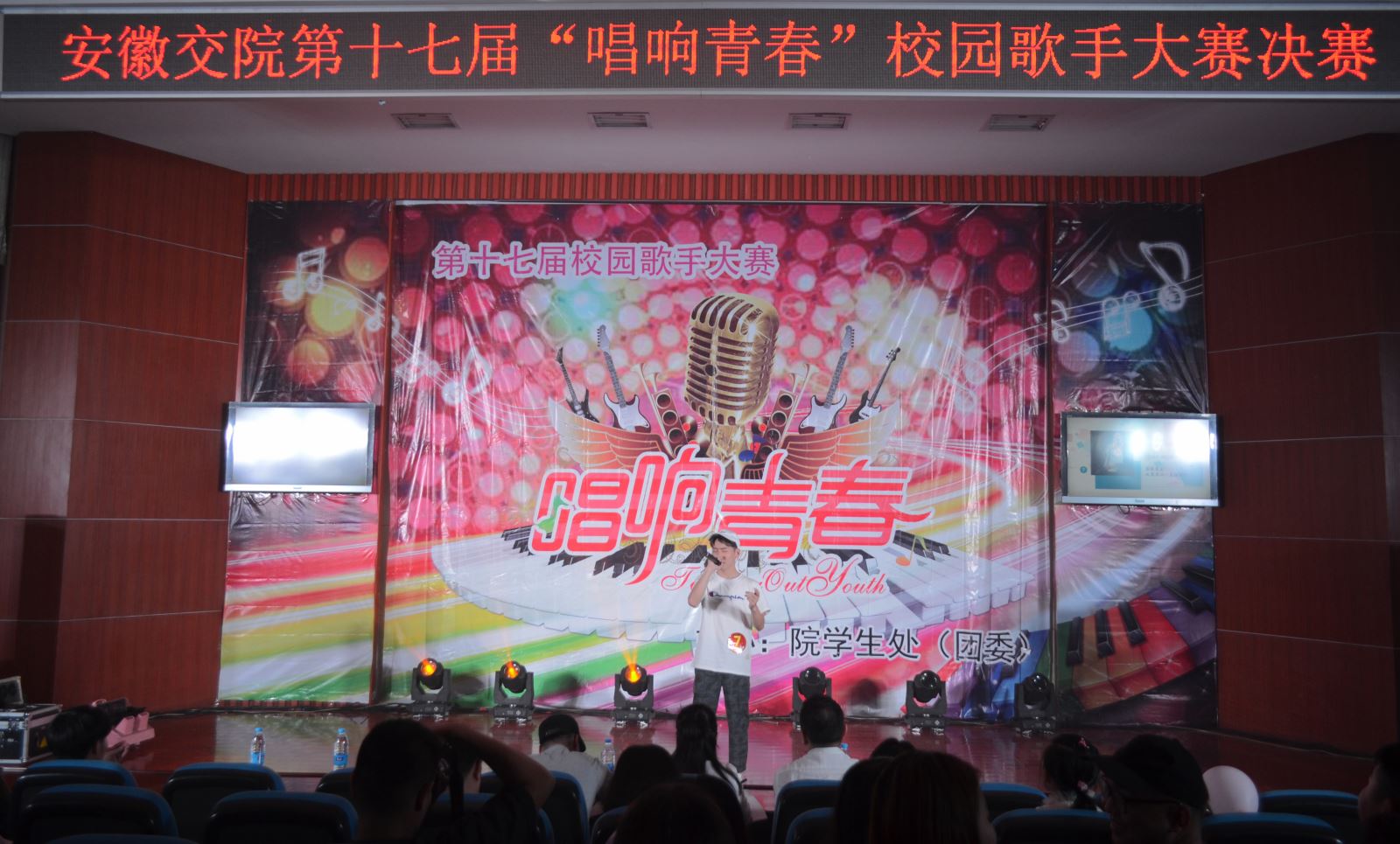 6月21号晚,学院第十七届“唱响青春”校园歌手大赛决赛在北区八角楼进行。活动特邀徽京剧院国家二级演员李丽娟,安徽广播电视台音乐广播主持人汤昆和安徽气象局天气预报节目主持人王维波担任大赛评委。