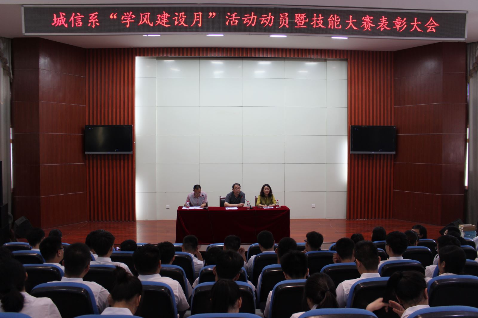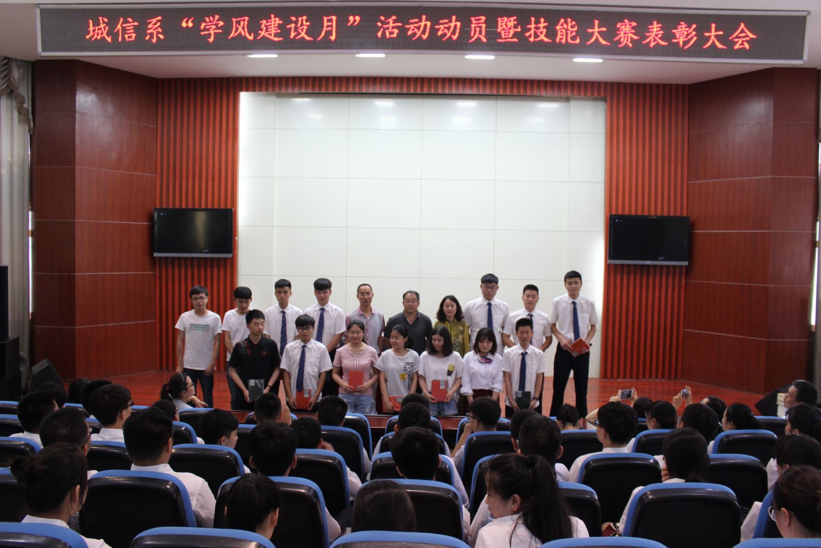 为了进一步加强城市轨道交通与信息工程系学风建设,激发广大在校大学生积极参与各级各类职业技能大赛的积极性,进一步强化素质教育的力度,发挥学生干部在“学风建设月”中的模范带头作用,调动每一名同学的积极性,不断拓展我系高技能应用型人才培养的内涵和深度, 2018年5月16日,城市轨道交通与信息工程系在学院北区八角楼多功能报告厅举办“学风建设月”活动动员暨技能大赛表彰大会。系党总支书记汪倩、系主任李锐、学管人员及2016、2017级各班同学代表参加了本次大会。