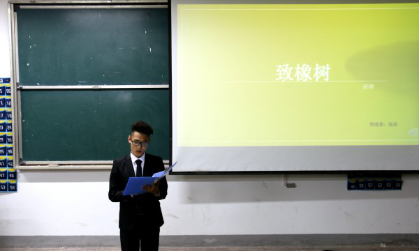 本次比赛共有十组参赛选手,在主持人宣布完比赛规则后,各组选手按抽签顺序依次上场。各组的诵读形式多样,或集体诵读,或个人独诵,并适当配以音乐和PPT,充分展现了诗文朗诵的艺术感染力和舞台表现力。17电子班张亮同学带来的《致橡树》,将自己的爱情观表达的淋漓尽致,充满着向往和憧憬。陈倪同学朗诵的《谈生命》,以“一江春水”和“一棵小树”为例,揭示了生命的生长,壮大和衰老的规律,她用充沛的感情为我们描绘了一幅生机勃勃的大自然美景,带我们走近,触摸它。选手们的深情诵读,让现场观众徜徉其中,聆听和欣赏中华文明之美。