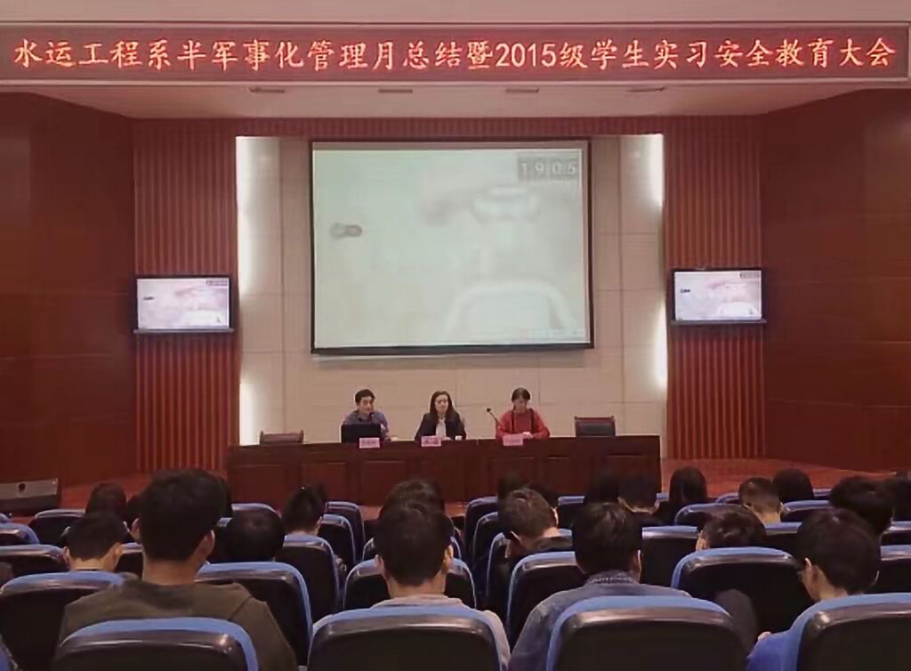 10月24日晚,水运工程系在多功能报告厅举行“半军事化管理月总结暨2015级学生实习安全教育大会”。系党支部书记朱蓉、航海教研室主任王在高、系学管老师卜丽媛和全体学生参加了会议。