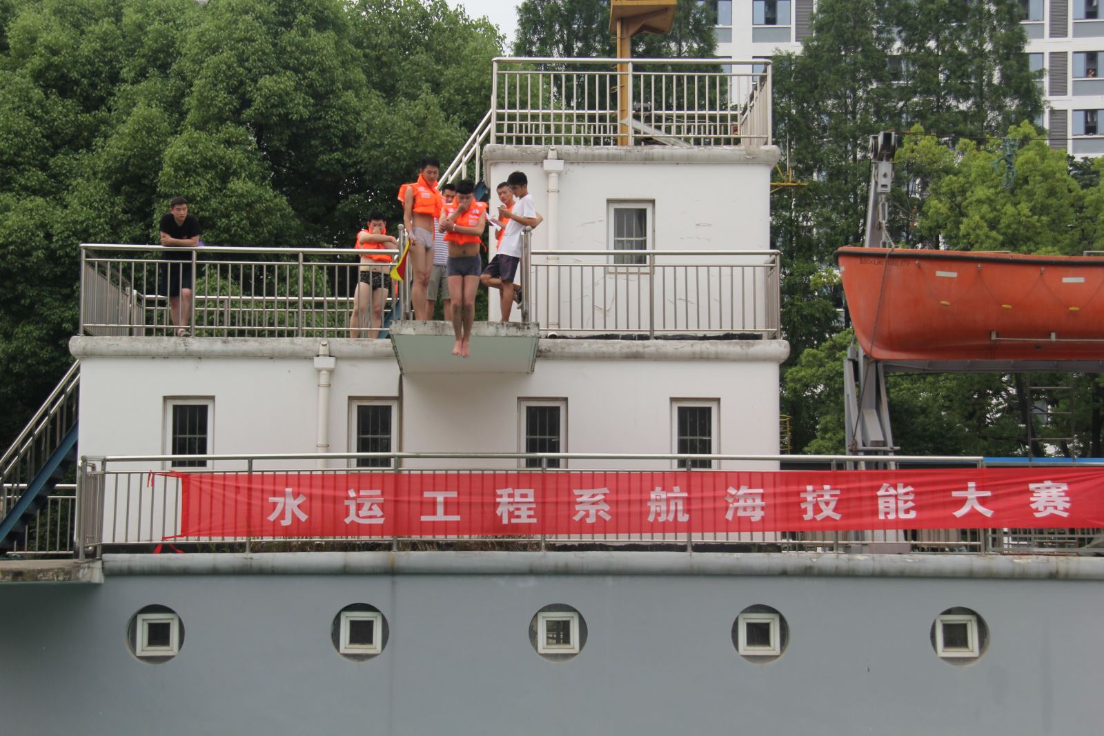 6月24日,在模拟船实训场地开展跳水实操比赛,包括荡桨、5米跳水、救生艇放降翻转、个人求生等一系列模拟真实海难环境的救生演习,旨在提高航海类专业学生的求知欲望和专业技能,激发航海类学生热爱海洋,献身航运的专业精神。