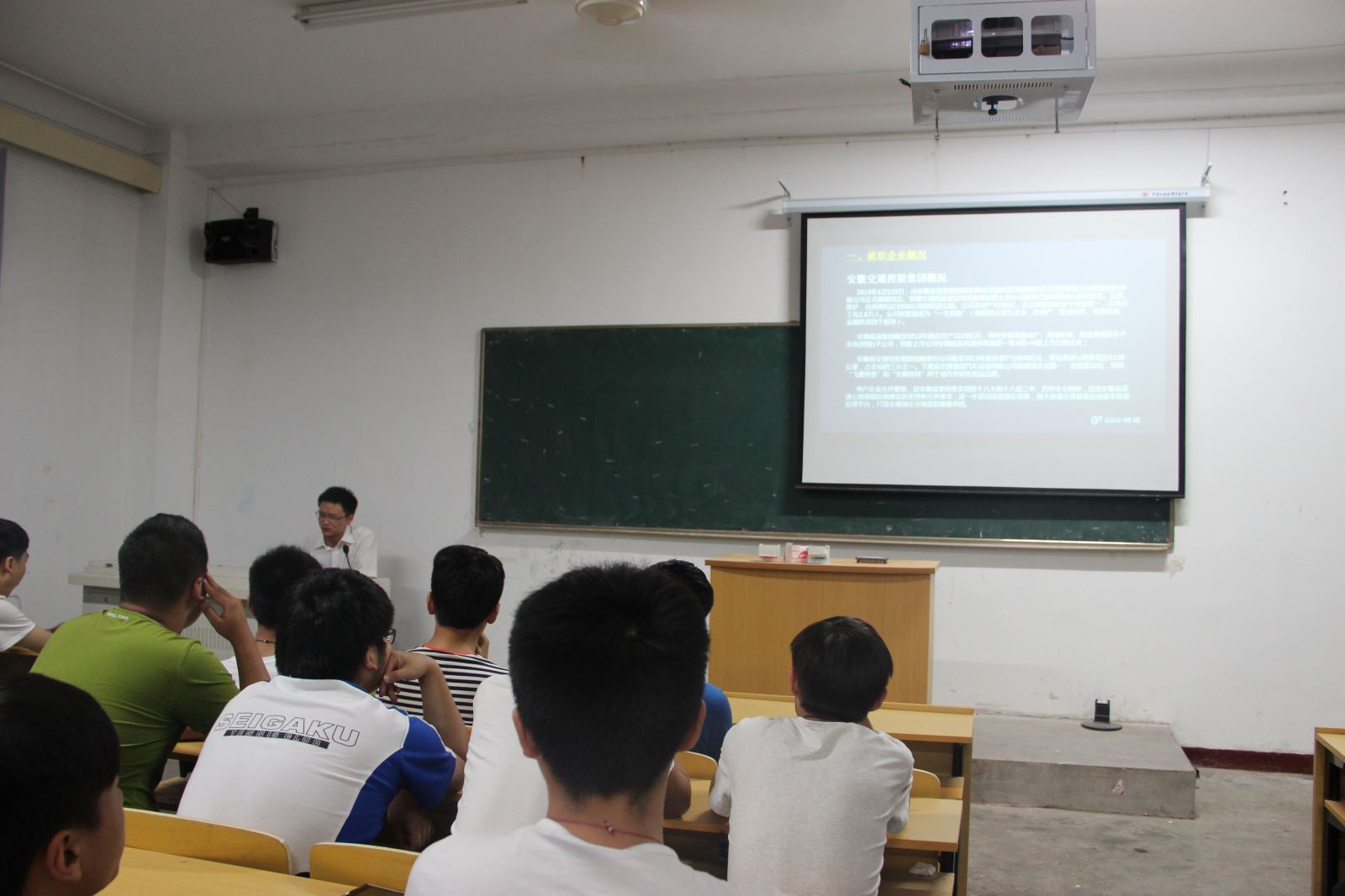 2015年5月18日晚七点,九二级校友杨群山先生,安徽高速驿达公司副总经理应邀回到阔别已久的母校,在南区一楼多媒体教室与学弟学妹做了交流与沟通。